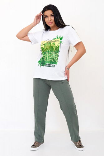 Женский костюм, выполненный из приятного к телу камуфляжного футера, состоит из толстовки и брюк. Толстовку оттенка хаки дополняет капюшон с плоским черным шнуром и тракторная молния, которая несет, как декоративную, так и функциональную роль. Низ и рукав изделия на резинке, спереди имеется удобный накладной вместительный карман с клапаном. Брюки свободные на резинке с боковыми и накладными карманами с клапанами. Костюм декорирован светоотражающими лентами и полукольцами. Комфорт, удобство и безопасность - основные функции костюма. Брюки можно приобрести отдельно - модель 6326