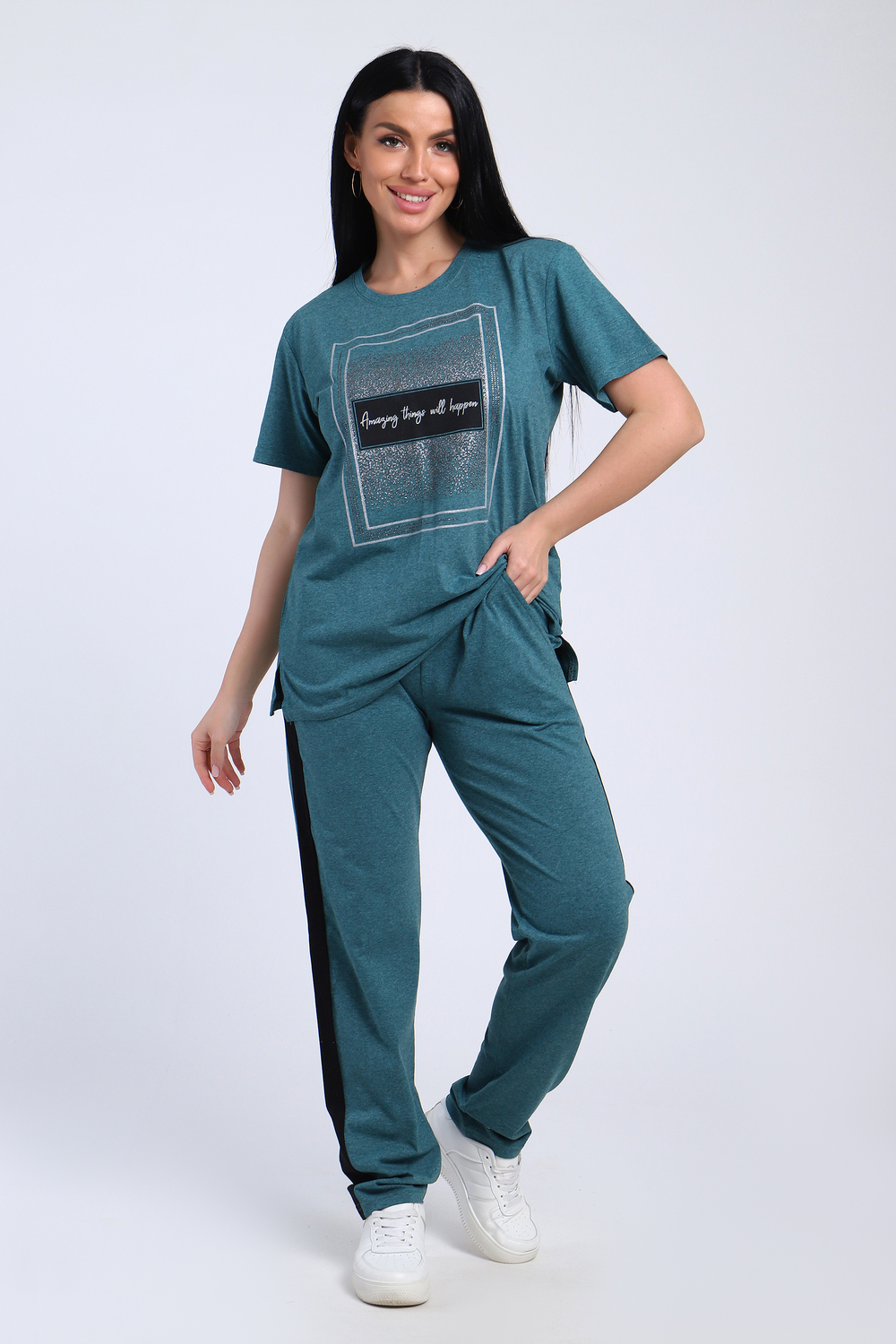 Классический и удобный трикотажный костюм с брюками из легкой хлопковой ткани! В комплекте костюма представлены кофта свободного кроя и брюки универсальной посадки с лампасами по бокам. Кофта украшена лаконичным принтом. Костюм - идеальный вариант домашней одежды для женщин, также прекрасно подойдет и для повседневной носки.