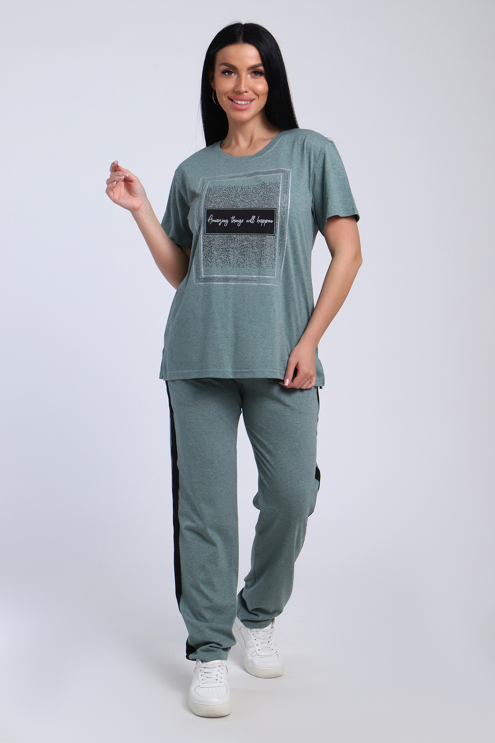 Классический и удобный трикотажный костюм с брюками из легкой хлопковой ткани! В комплекте костюма представлены кофта свободного кроя и брюки универсальной посадки с лампасами по бокам. Кофта украшена лаконичным принтом. Костюм - идеальный вариант домашней одежды для женщин, также прекрасно подойдет и для повседневной носки.