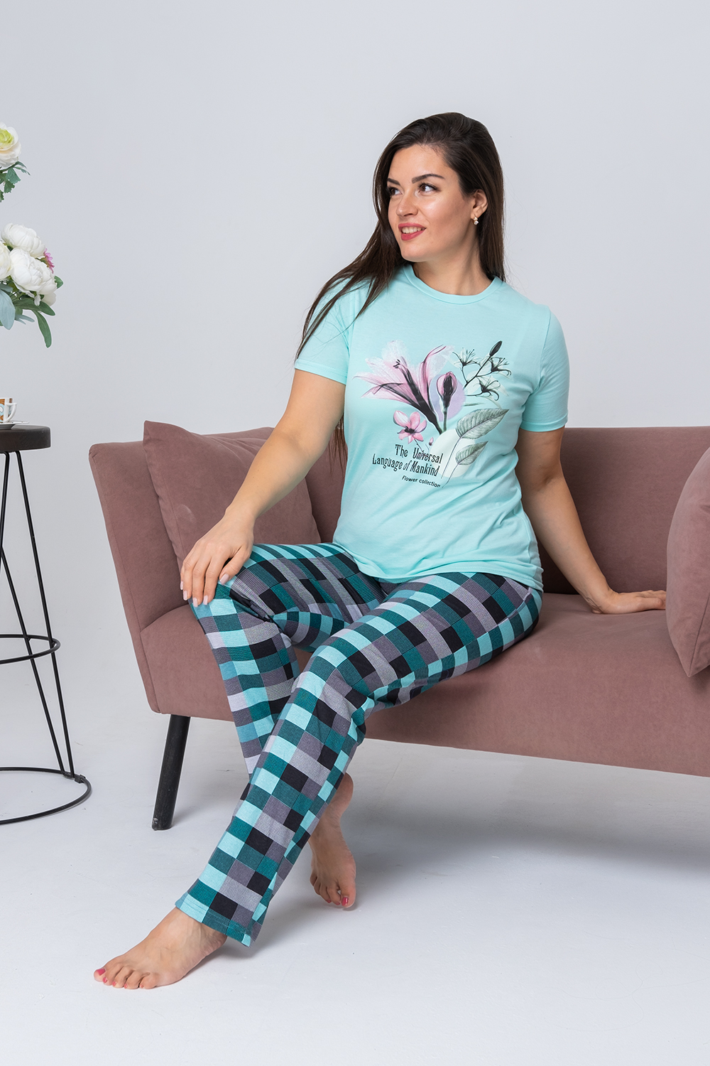 Костюм женский состоит из футболки с коротким рукавом из ткани кулирка гладь, на полочке красивый принт, и брюк из ткани кулирка, принт - клетка. Костюм для дома, отдыха, комфортный, удобный, не меняет цвет после стирки.