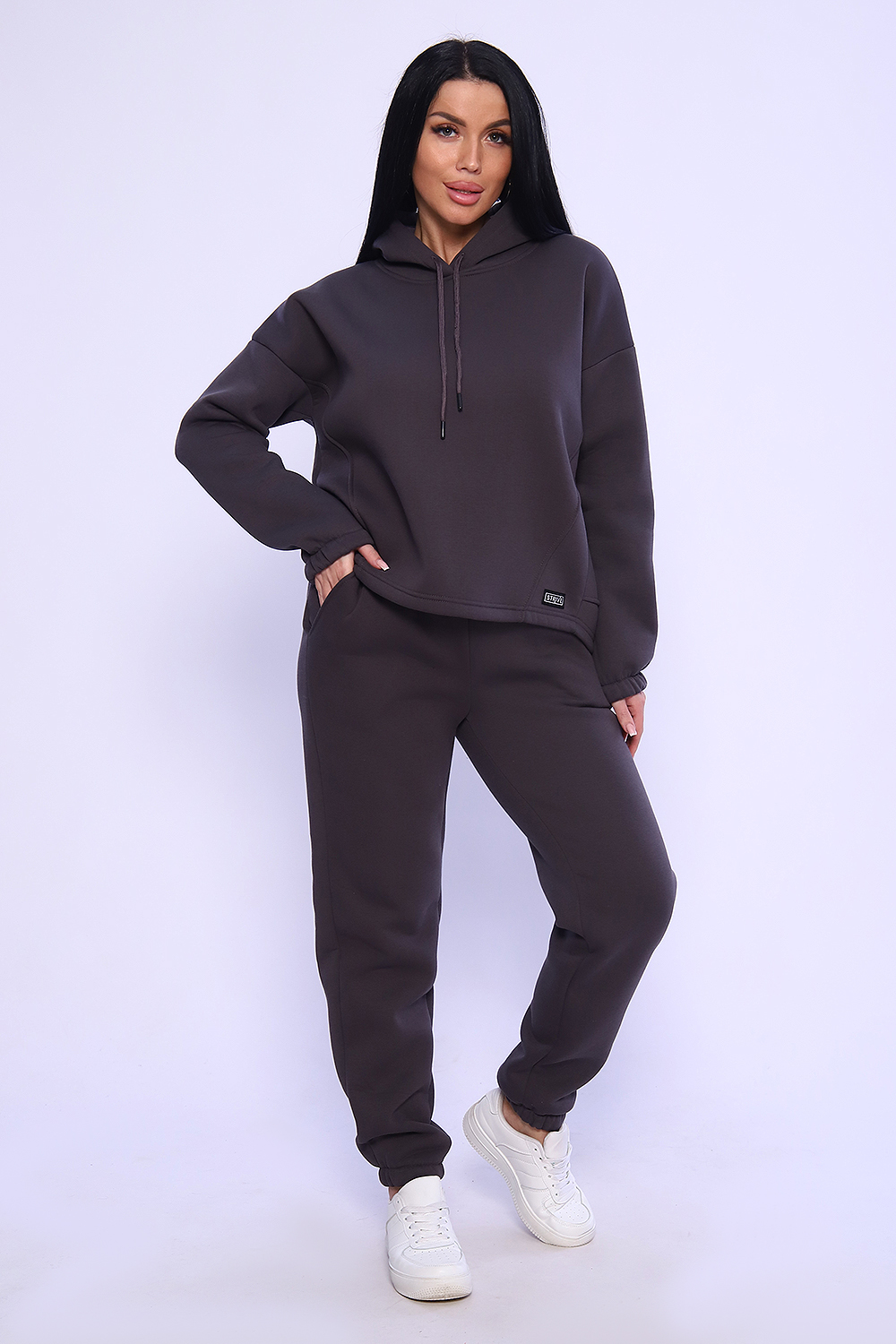 Теплый костюм выполнен из футера 3-х нитки с начесом с содержанием хлопка премиум качества. Костюм состоит из объёмной толстовки в стиле оверсайз и джогеров. Низ брюк и рукавов на толстовке обработан резинкой. Пояс брюк на резинке, для удобства по бокам расположены прорезные карманы. Перед использованием желательно постирать костюм при 30 градусах, тогда излишний ворс примнется.