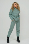 Костюм состоит из куртки и брюк. Брюки на поясе, с карманами, с лампасами из отделочного полотна вдоль боковых швов. Куртка свободная, с капюшоном, длиной до середины бедра, на поясе. Рукав втачной, длинный, со вставками из отделочного полотна, на манжете. На полочке расположен карман кенгуру. В верхней части полочки обработана молния и вставлена сетка.