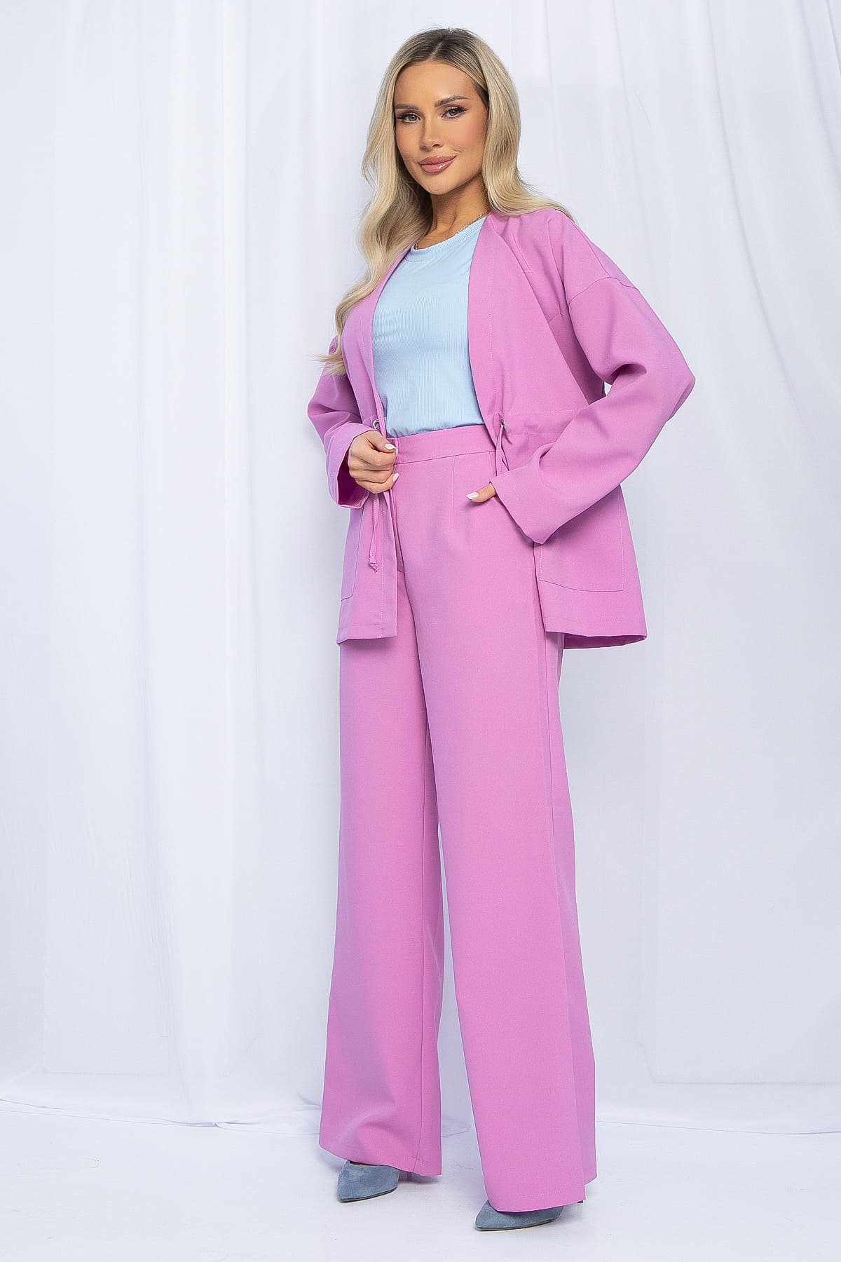 Костюм двойка, состоящий из элегантного жакета и брюк, станет идеальным выбором для деловых встреч и особых мероприятий. Жакет выполнен в современном дизайне: вы можете затянуть шнурки и подчеркнуть фигуру, а можете оставить жакет в свободном виде. Брюки оснащены удобной застёжкой на пуговицу и молнию, что обеспечивает надежную посадку и комфорт в носке.