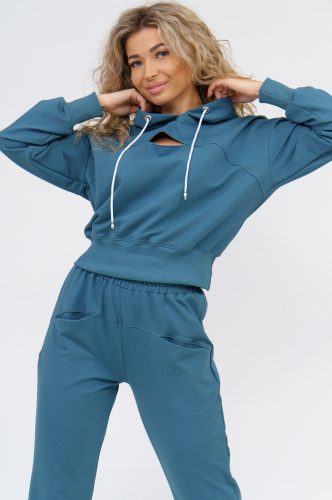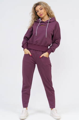 Стильный женский костюм спортивного кроя подойдёт и для дома и для прогулок. Укороченная толстовка с капюшоном подчеркнёт стройность фигуры. Оригинальный элемент - небольшой вырез по линии кокетки в области груди. Рукава и нижняя часть толстовки на манжете. Брюки слегка зауженные внизу, на кокетке, с карманами, пояс на широкой резинке.
