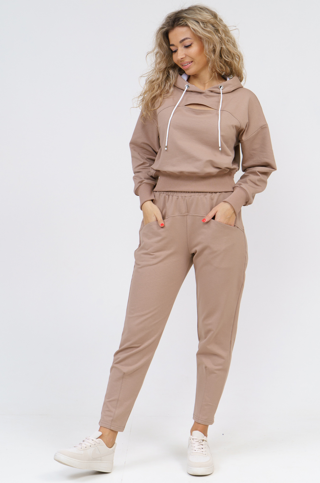 Стильный женский костюм спортивного кроя подойдёт и для дома и для прогулок. Укороченная толстовка с капюшоном подчеркнёт стройность фигуры. Оригинальный элемент - небольшой вырез по линии кокетки в области груди. Рукава и нижняя часть толстовки на манжете. Брюки слегка зауженные внизу, на кокетке, с карманами, пояс на широкой резинке.