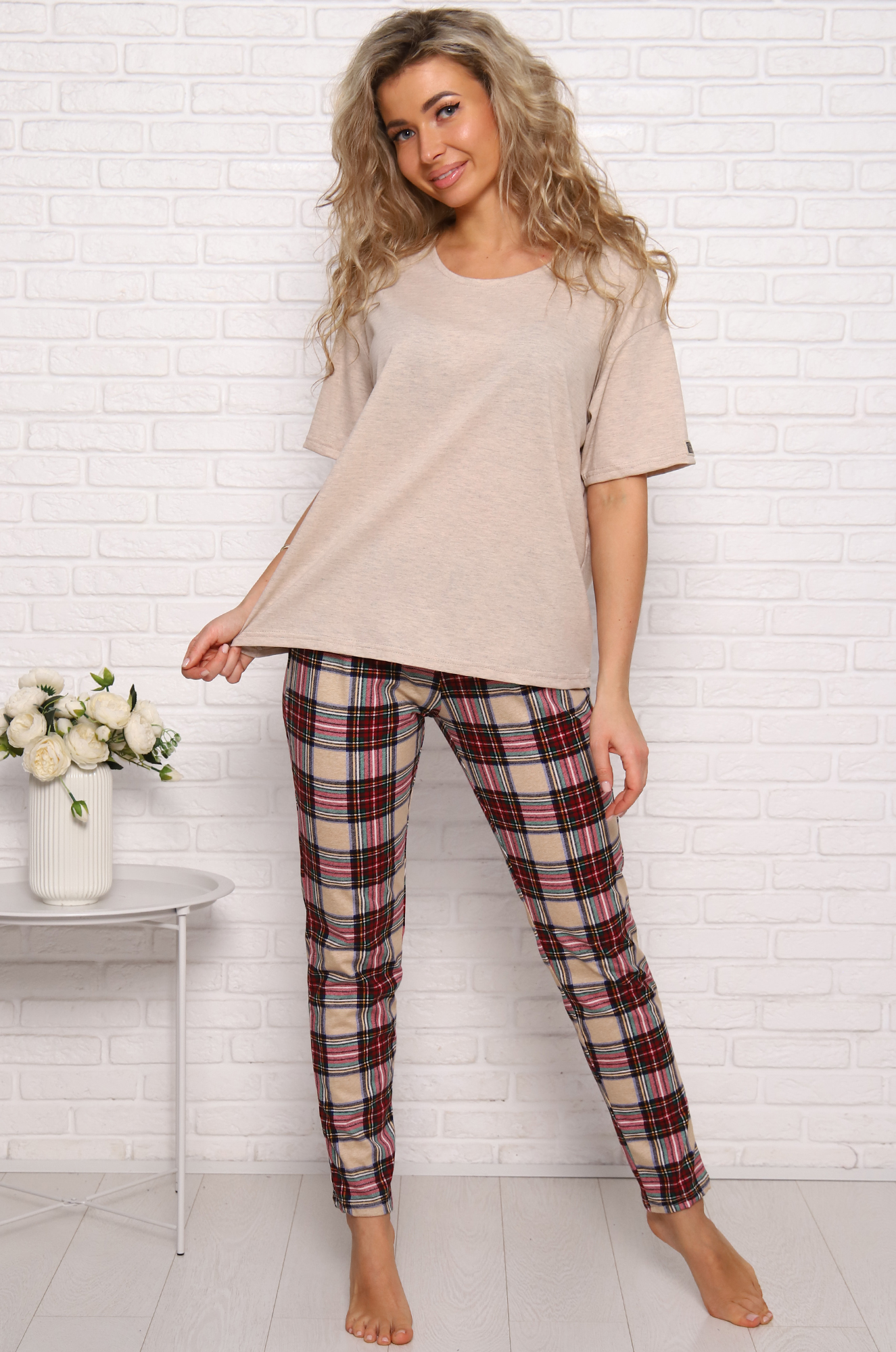 Симпатичный хлопковый костюм для дома и отдыха. Футболка в стиле оверсайз, модный удлинённый рукав, спущенное плечо, на рукаве стильная нашивка. Модель брюк зауженная, с комфортной посадкой, и удобными боковыми карманами, пояс на широкой резинке.