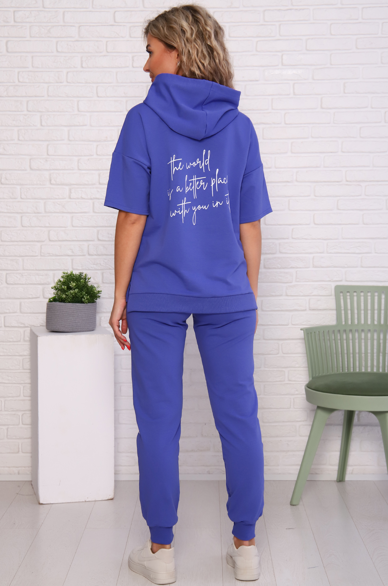 Женский костюм в спортивном стиле. Футболка свободного кроя, с капюшоном, рукав удлинённый, плечевой шов спущенный,  карман-кенгуру. Брюки на эластичном манжете, пояс на широкой резинке, комфортная посадка. Ткань футер с лайкрой.