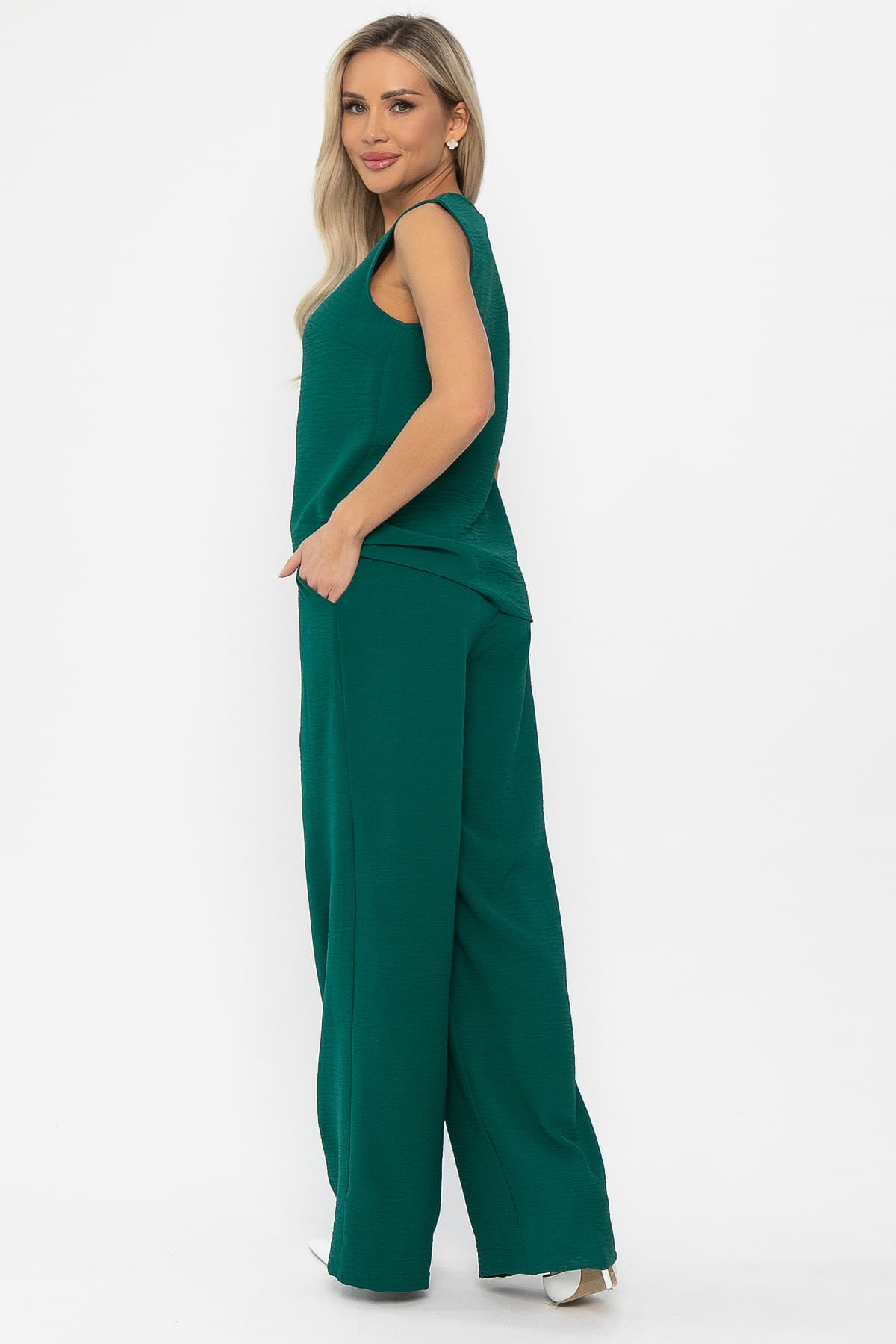 Женский костюм-двойка в тёмно-зелёном цвете — это то, что нужно для тех, кто ищет баланс между удобством и элегантностью.