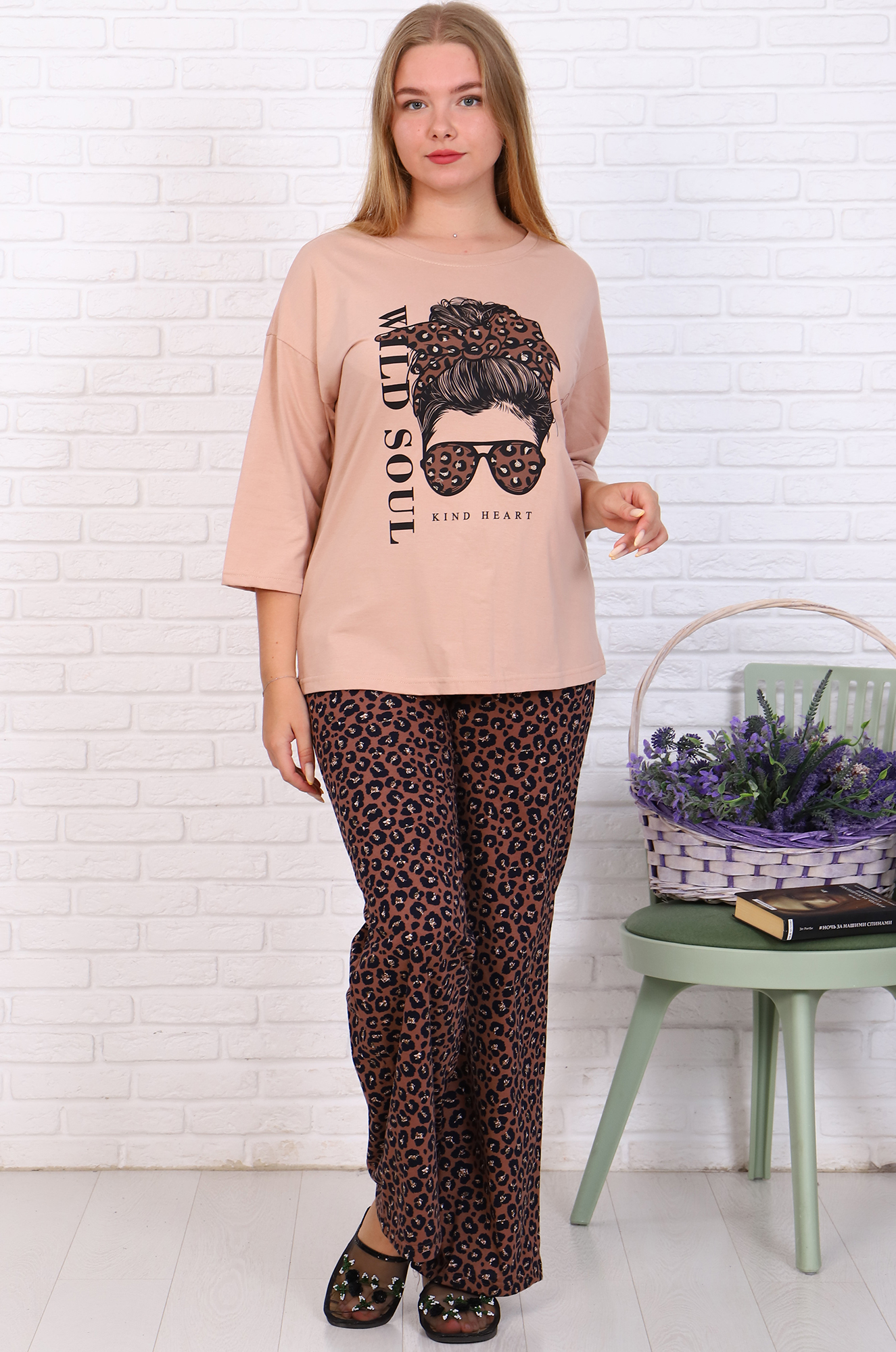 Очень симпатичный и комфортный домашний костюм для современных женщин. Футболка классического прямого кроя, на полочке тематический печатный принт, рукав спущенный, длина 3/4. Широкие брюки модного свободного кроя, с удобными боковыми карманами, пояс на широкой резинке.