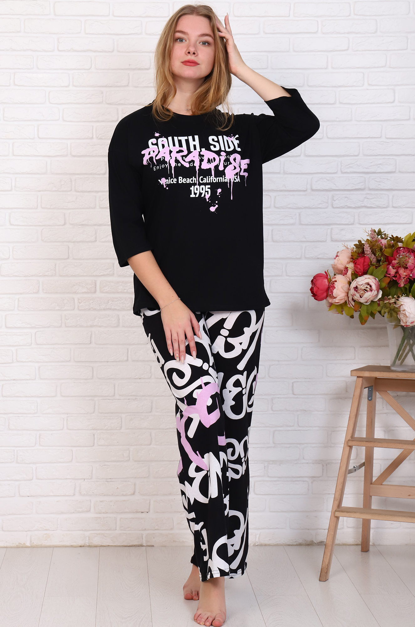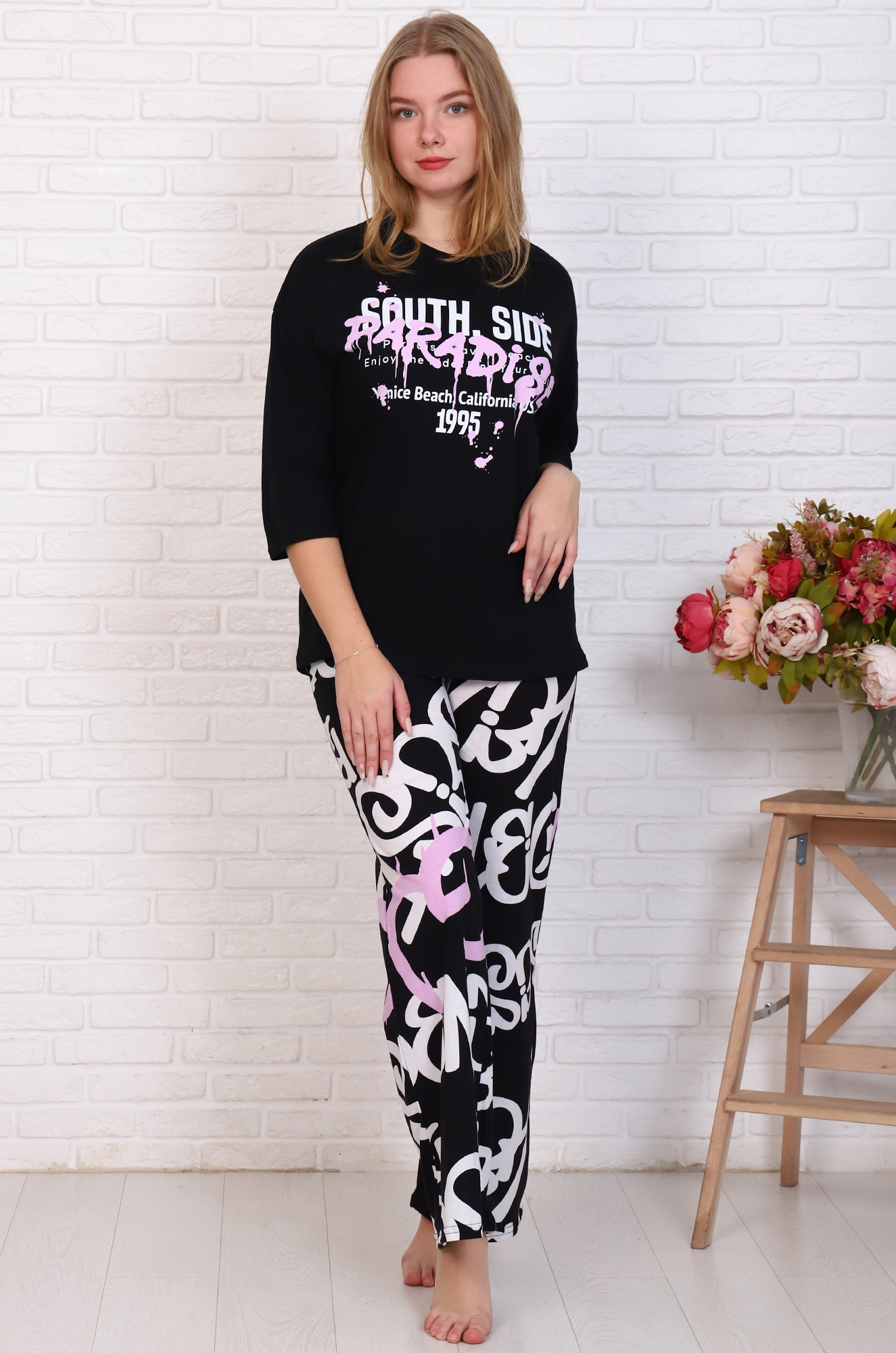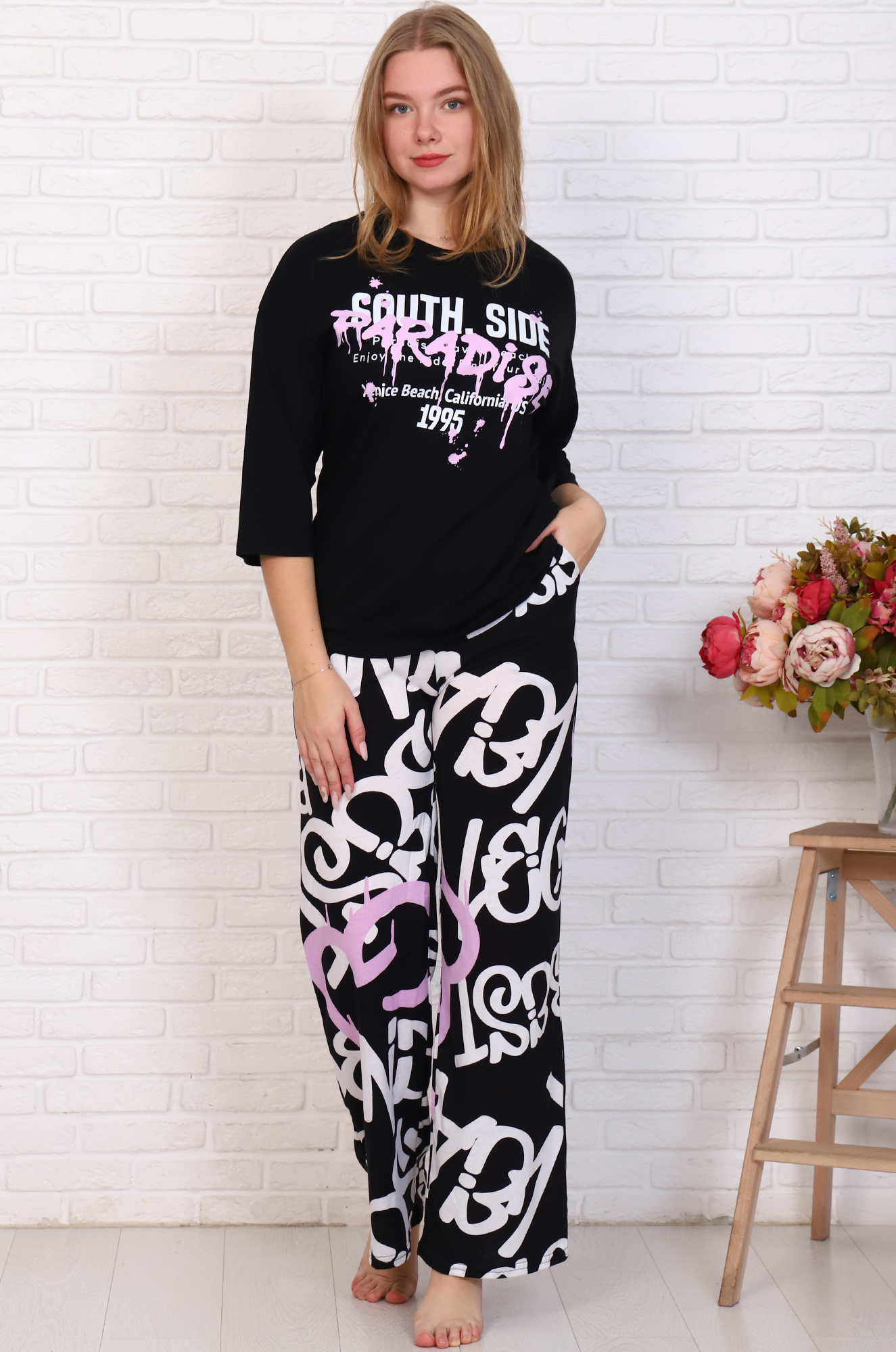 Очень симпатичный, яркий и комфортный домашний костюм для современных женщин. Футболка классического прямого кроя, на полочке тематический печатный принт, рукав спущенный, длина 3/4. Широкие брюки модного свободного кроя, с удобными боковыми карманами, пояс на широкой резинке.