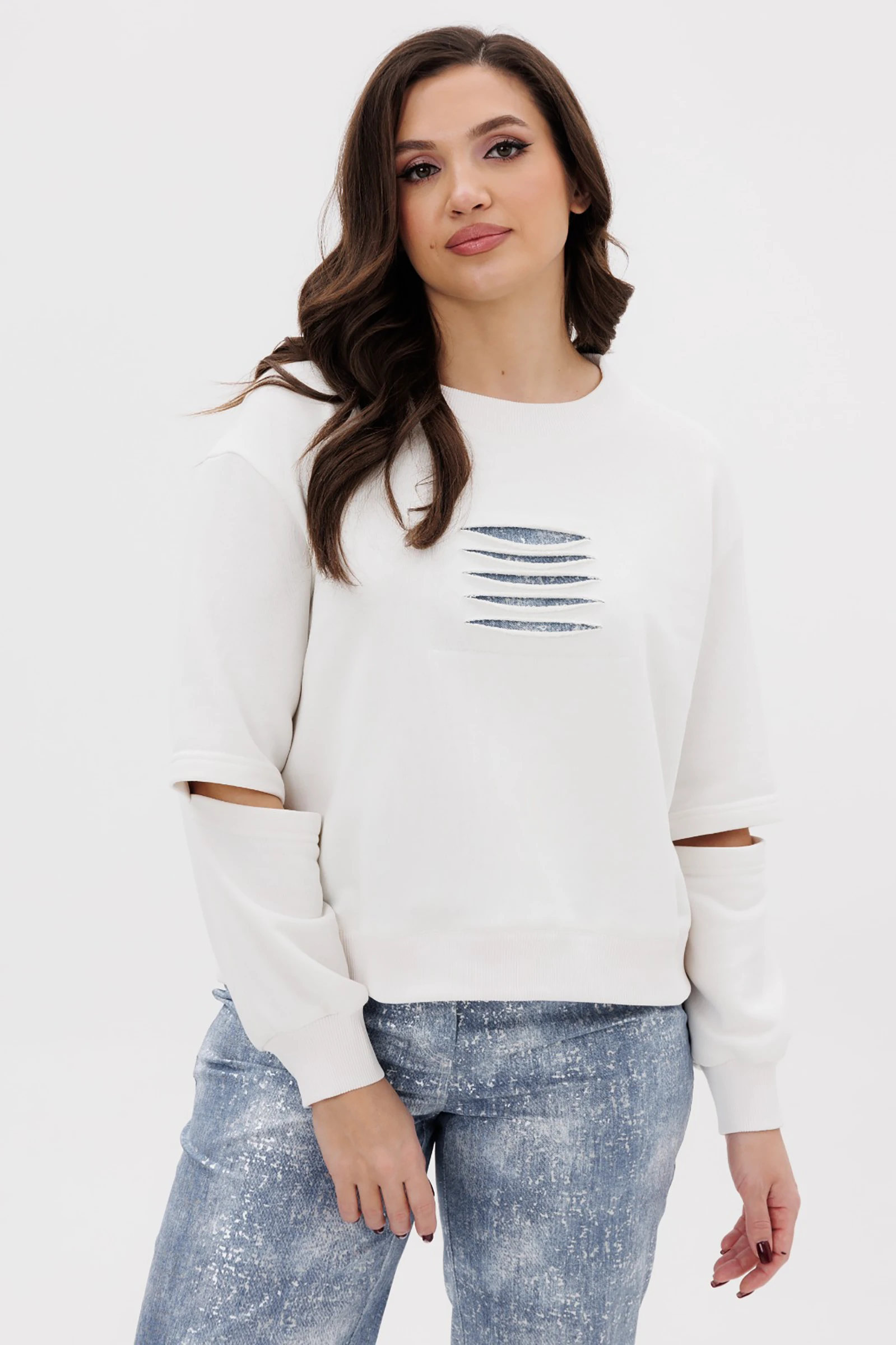 Комплект женский 2-х предметный. Свитшот свободного силуэта, с заниженной линией плеча, рукавом, расширенным в области оката, дизайнерской вставкой на полочке. Рукав двухшовный с поперечным подрезом на передней части.