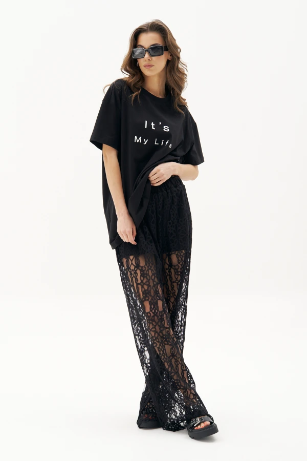 Мода лета 2024 представляет прозрачные ткани, как один из ключевых трендов сезона.Платья из таких полотен уже давно не в новинку, но в этом сезоне к ним мы добавили другую вариацию женской одежды : невероятный брючный комплект, который, развеваясь шикарными складками, создаёт у окружающих иллюзию подглядывания.Свободная футболка и гипюровые брюки с эластичными шортами внутри.Футболка широкая, удлинённая, с дизайнерским принтом и заниженной линией плеча.Брюки в свободном, расслабленном стиле, на притачном эластичном поясе и с подкладкой шортами из хб трикотажного полотна.Длина брюк около 105см. черный