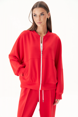 Свободный, упрямлённый свитшот с заниженной линией плеча, воротником-стойкой, частичной застёжкой на тесьму-молнию, прорезными карманами, рукавом, состоящим из 3-х частей с притачной манжетой и кулисой с регулирующей эластичной тесьмой и фиксаторами по низу изделия.