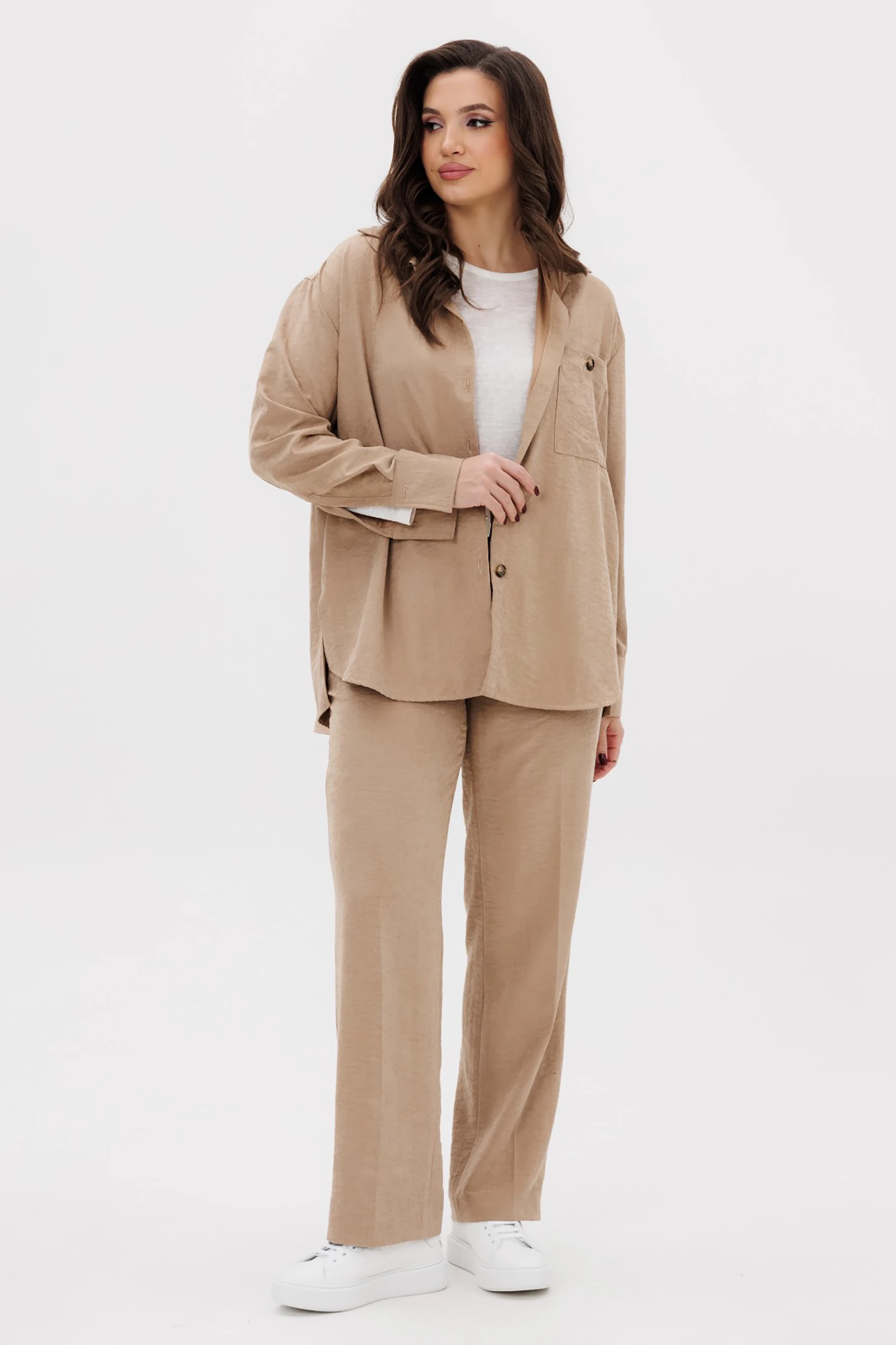 Несмотря на то, что это достаточно выдержанный ансамбль, сочетание рубашки с длинным рукавом и брюк - постоянный выбор трендсеттеров, пленяющих сердца тех, кто старается следить за направлениями в моде. Свободная классического, рубашечного покроя, с цельной застёжкой и классическим рубашечным воротником. Полочка с накладным карманом, спинка с отрезной кокеткой и мягкой бантовой складкой. Рукав рубашечный с отрезной манжетой на застёжке. Брюки классические на притачном поясе со шлёвками с наклонными боковыми карманами. По передним половинкам брюк - мягкие складки, по задним половинкам - вытачки и прорезной карман с листочкой. Длина рубашки около 74 см. Длина рукава около 75 см. Длина брюк около 105 см.