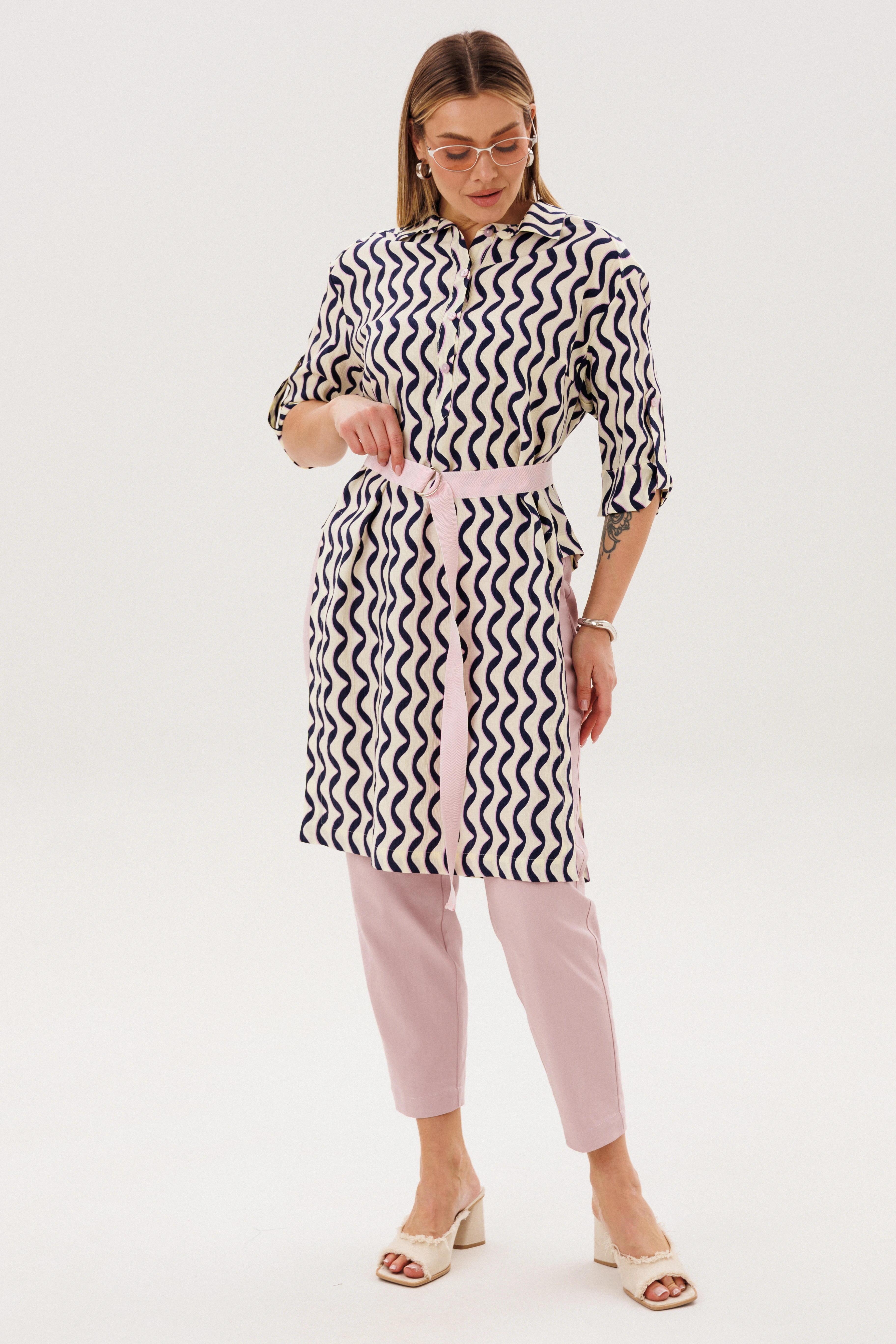 Комплект состоит из удлинённой рубашки-туники и брюк.