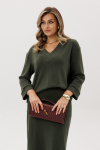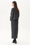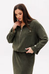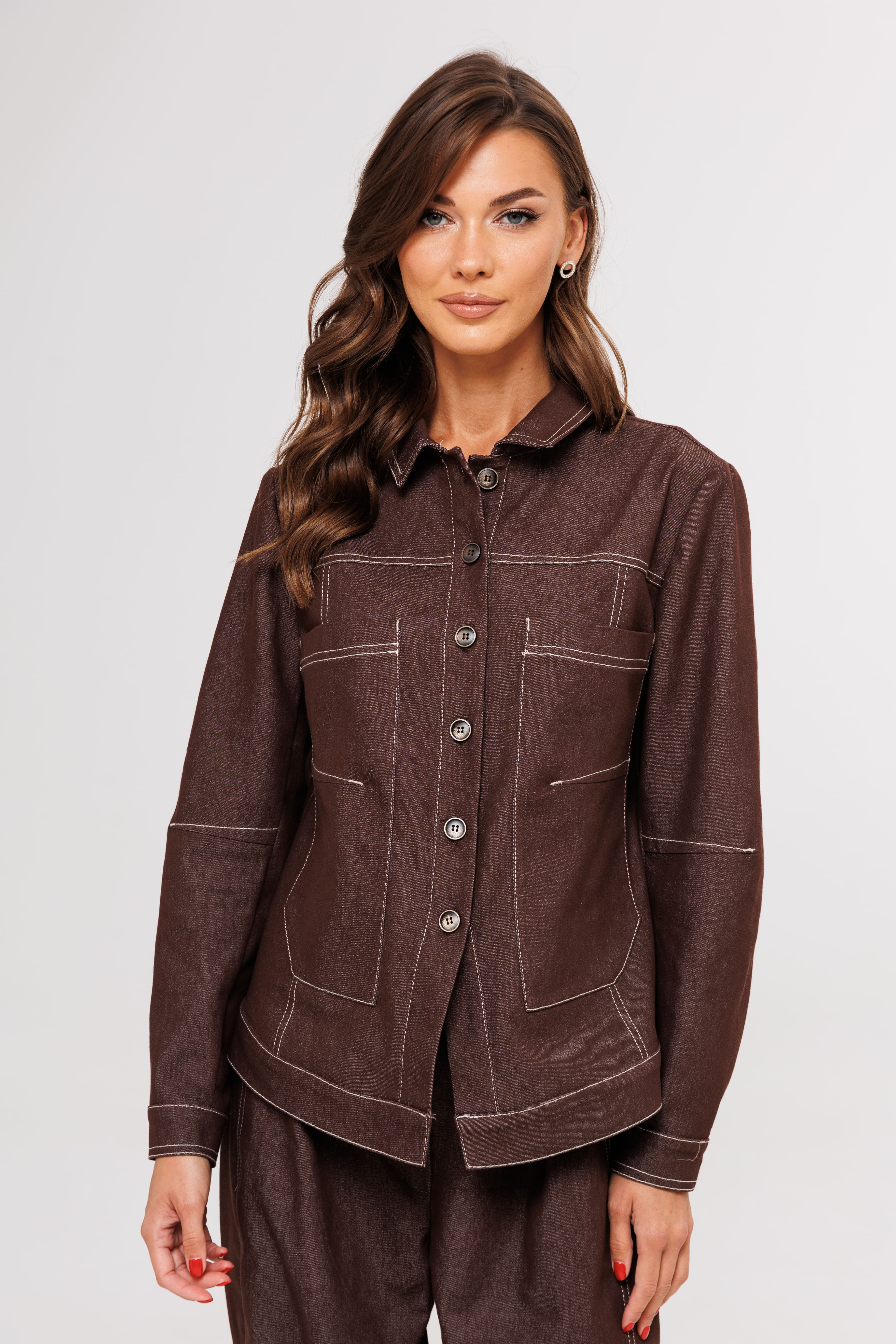 Жакет-рубашка полуприлегающего силуэта, втачного покроя с центральной фигурной застежкой на отрезной планке, втачным двухшовным рукавом на манжете и притачном поясом по низу, создающим слегка расширенную линию, имитирующую легкую баску. Полочка с отрезной кокеткой, вертикальным рельефом и фигурным накладным карманом нестандартной формы.