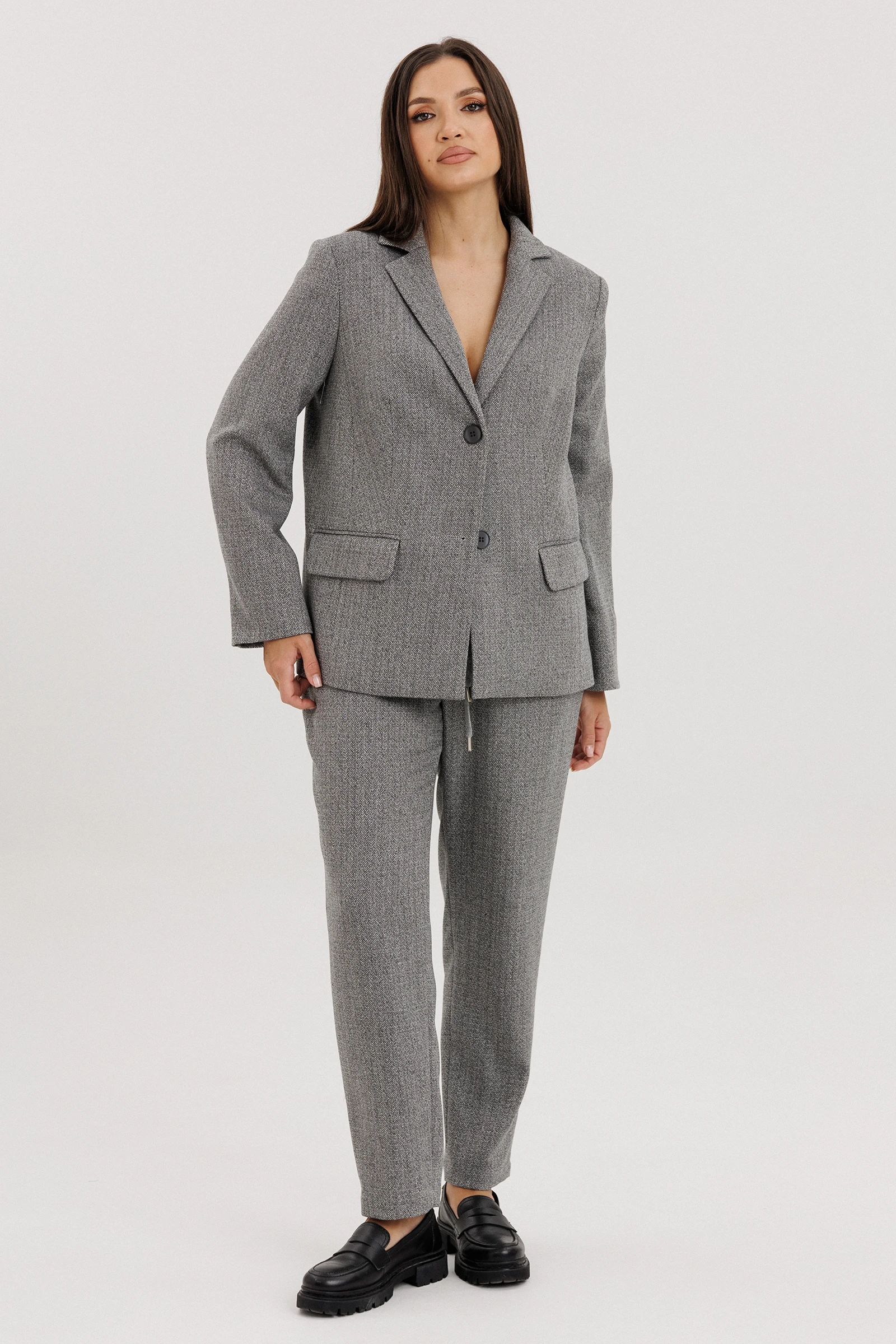 Силуэт свободный, слегка упрямлённый, покрой-втачной, воротник классический английский, линия борта фигурная, застёжка на две петли и пуговицы. Полочка с отрезным бочком, нагрудной вытачкой и прорезным карманом с клапаном. Спинка со средним швом и талиевой вытачкой. Рукав двухшовный с отлетной шлицей и отделочными пуговицами. Брюки свободные, на эластичном поясе с люверсами и отделочным шнуром. Передние половинки с боковыми накладными карманами. Длина пиджака около 67 см, длина рукава около 60 см. Длина брюк около 98 см
