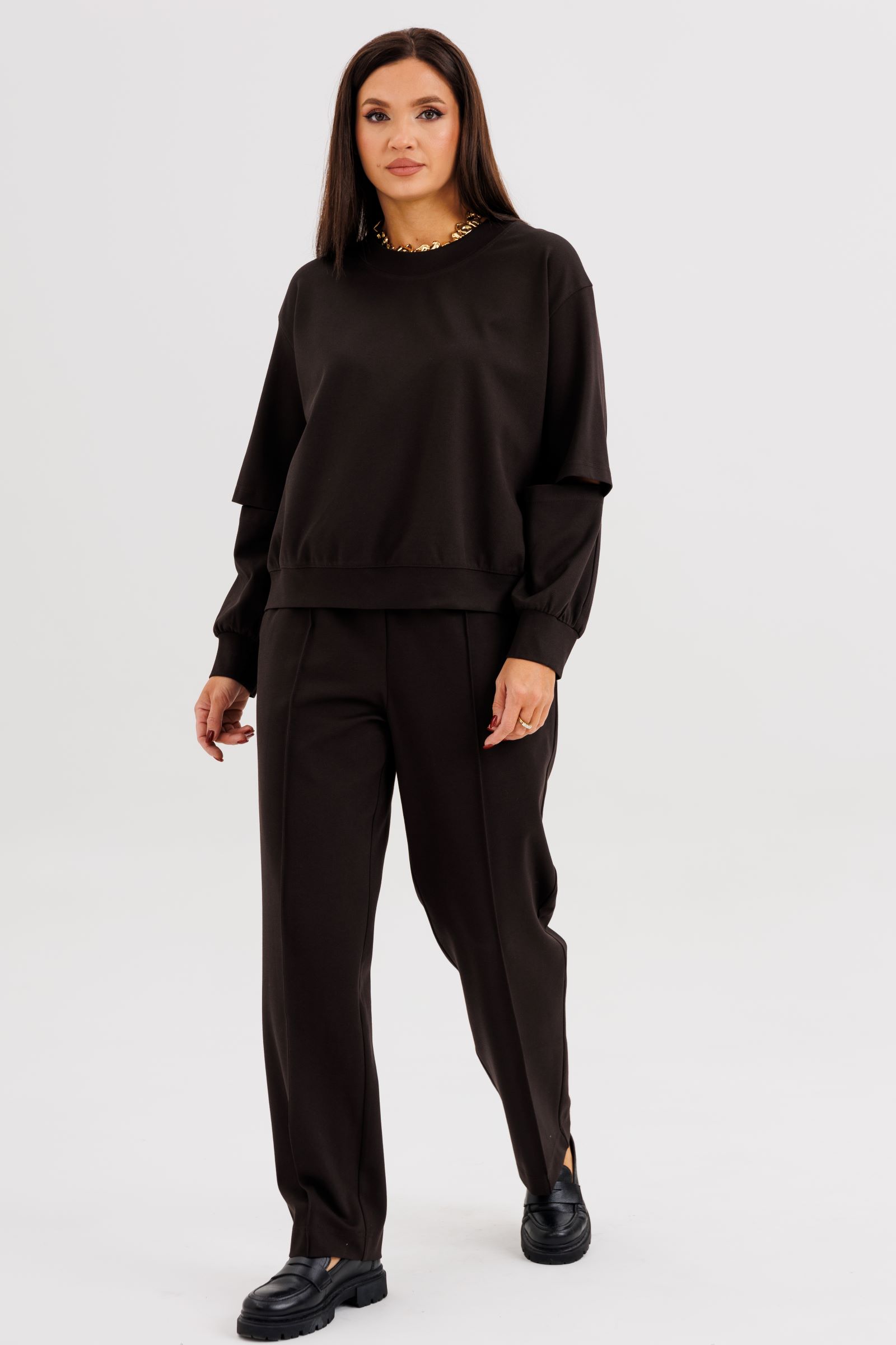 Свободный оверсайз свитшот с заниженной линией плеча, рукавом расширенным в области оката. По низу изделия и рукавов - притачной эластичный манжет. Рукав из 4-х частей с эффектным разрезом в области локтя.