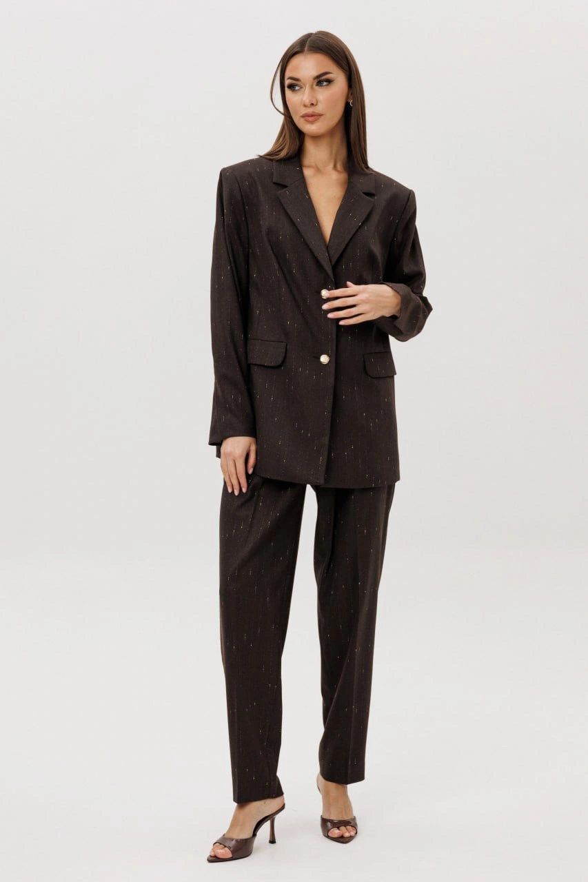 Жакет свободного расширенного силуэта, втачного покроя с центральной застёжкой и классическим английским воротником. Полочка с отрезным бочком, нагрудной вытачкой и прорезным карманом с клапаном. Спинка с центральным швом, шлицей и отрезным бочком. Рукав двухшовный с отлетной шлицей.