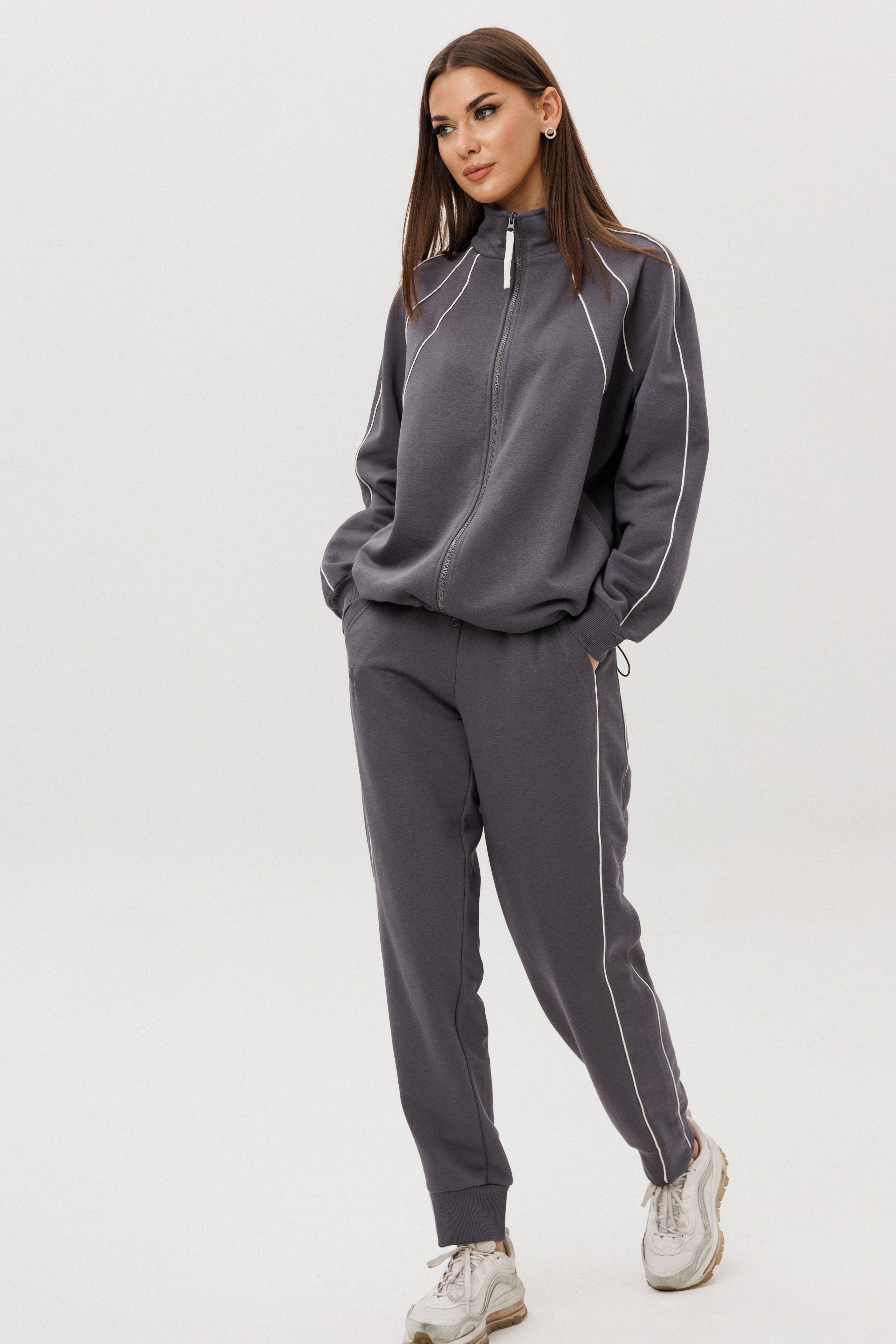 Современный костюм в стиле спорт-кэжуал — идеальный баланс комфорта и актуального дизайна. Модель выполнена из мягкого трикотажного полотна с добавлением хлопка, обеспечивающего приятные тактильные ощущения и свободу движений.