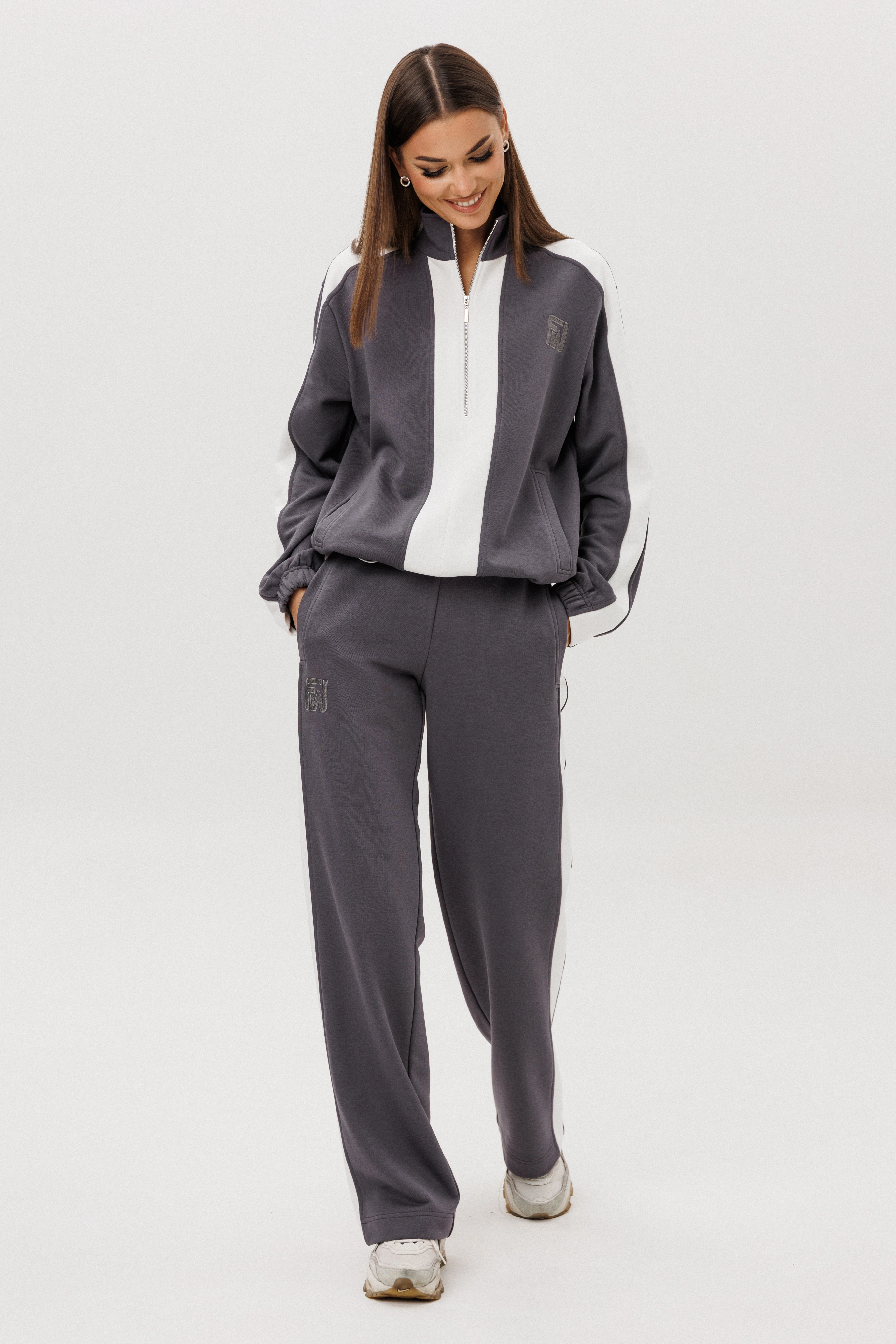 Контрастные лампасы на брюках, рукавах, по центру переда и низу придают модели особую динамичность и изысканность.