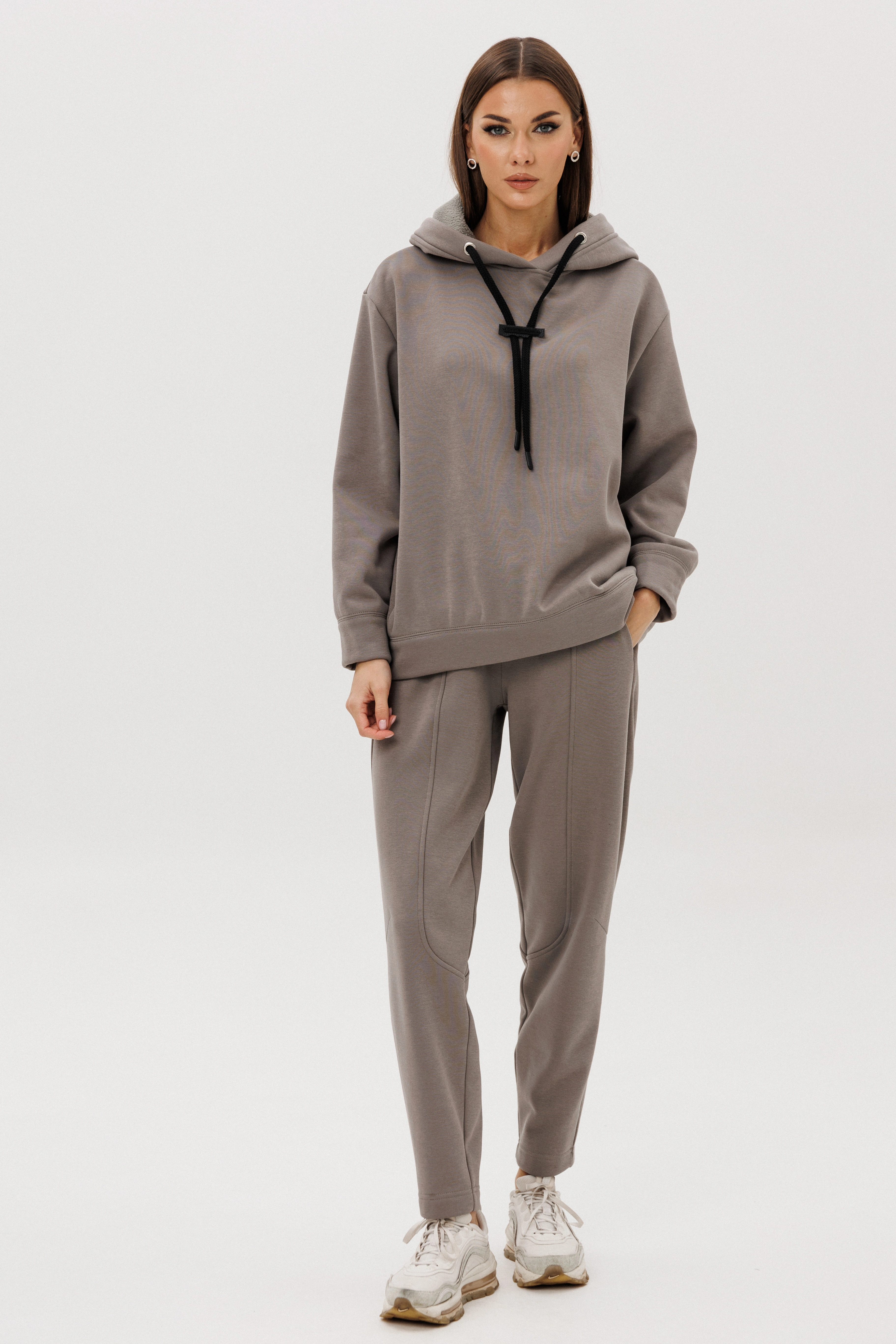 "Уютный костюм из тёплого хлопчатобумажного футера с мягким начёсом «барашек» — идеальное сочетание комфорта и современного стиля. Объёмный худи с капюшоном и контрастным шнуром создаёт расслабленный силуэт, а брюки со слегка зауженным кроем и декоративными строчками добавляют образу актуальности.