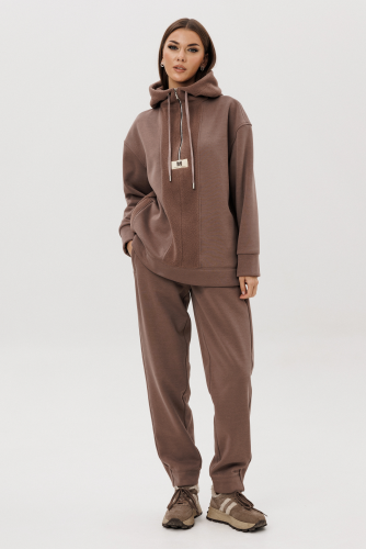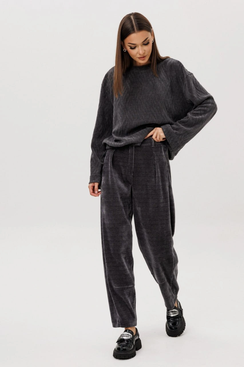 Свободный джемпер расширенного силуэта втачного покроя на заниженной линии плеча. Рукав расширенный в области оката. По низу  джемпера шнур- резинка с фиксаторами. Брюки """"баррел"""" на притачном поясе со шлёвками (эластичном в области спинки), с наклонными карманами , мягкими складками защипами по верху брюк."