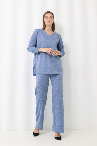 Свитер свободного кроя с V-образным притачным воротом. Длинный втачной рукав. Спинка изделия длиннее переда. Разрезы в боковых швах.
