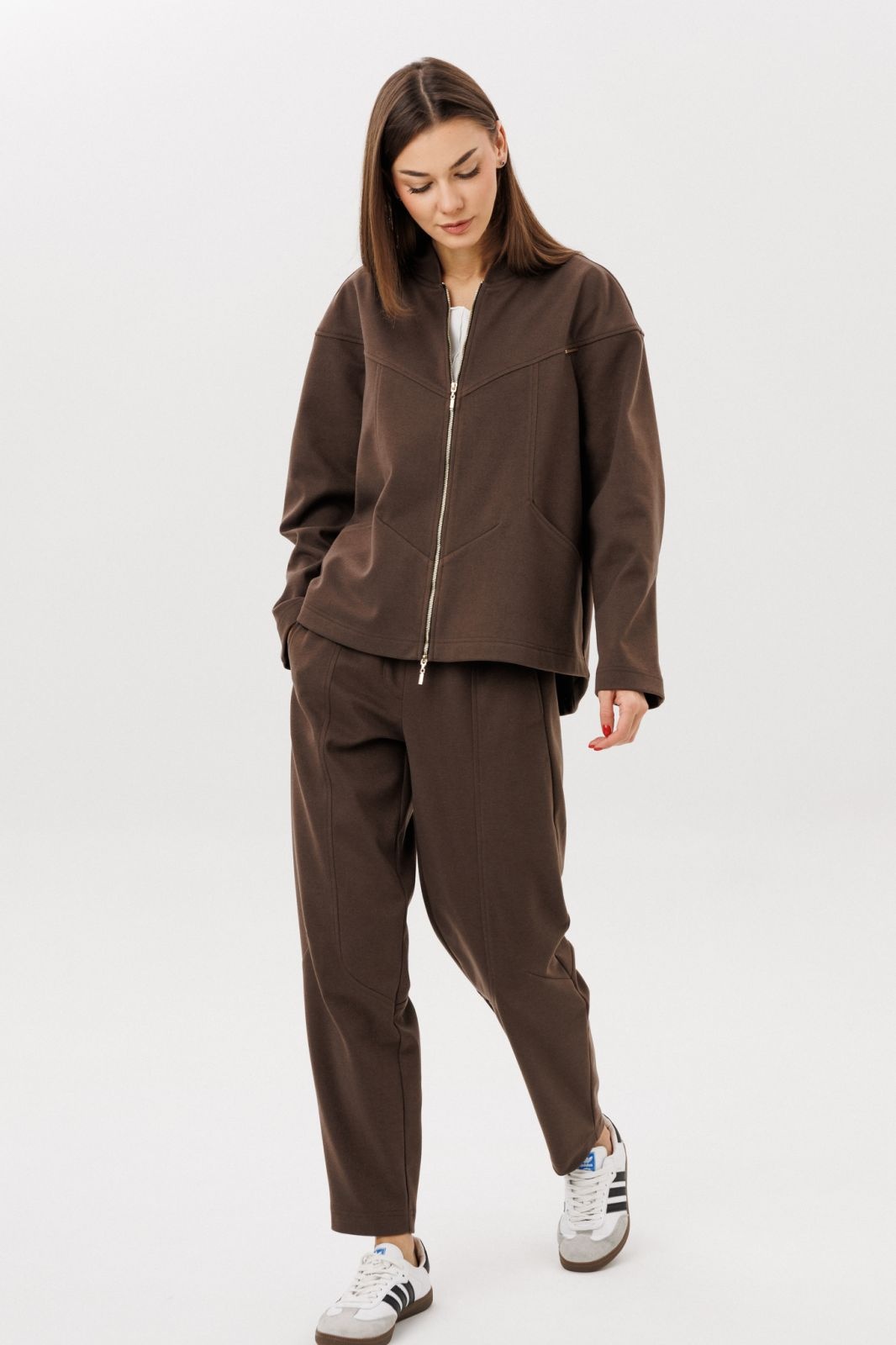Свободный силуэт, комбинированный покрой, центральная застежка на тесьму-молнию, капюшон рукав-частичный реглан с отрезной широкой манжетой и мягкой складкой в области локтя. Полочка с отрезной кокеткой и фигурным рельефом, переходящим в карман. Спинка с отрезной кокеткой. Брюки свободные, на эластичном поясе в области спинки, с фигурными вертикальными рельефами по центру передних и задних половинок, вытачками в области колена и боковым наклонным карманом.