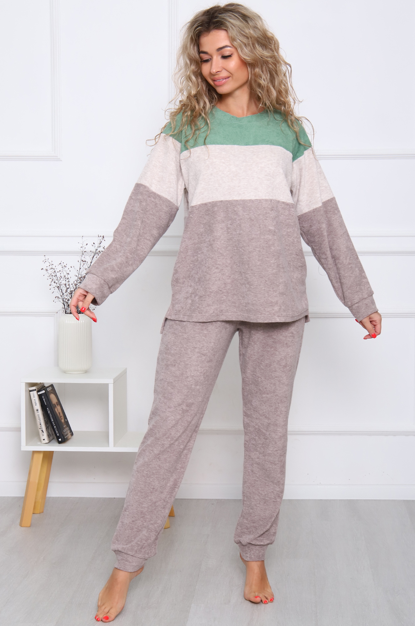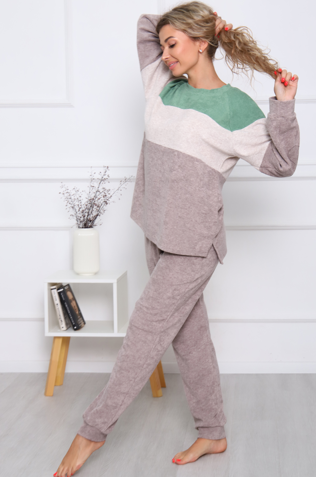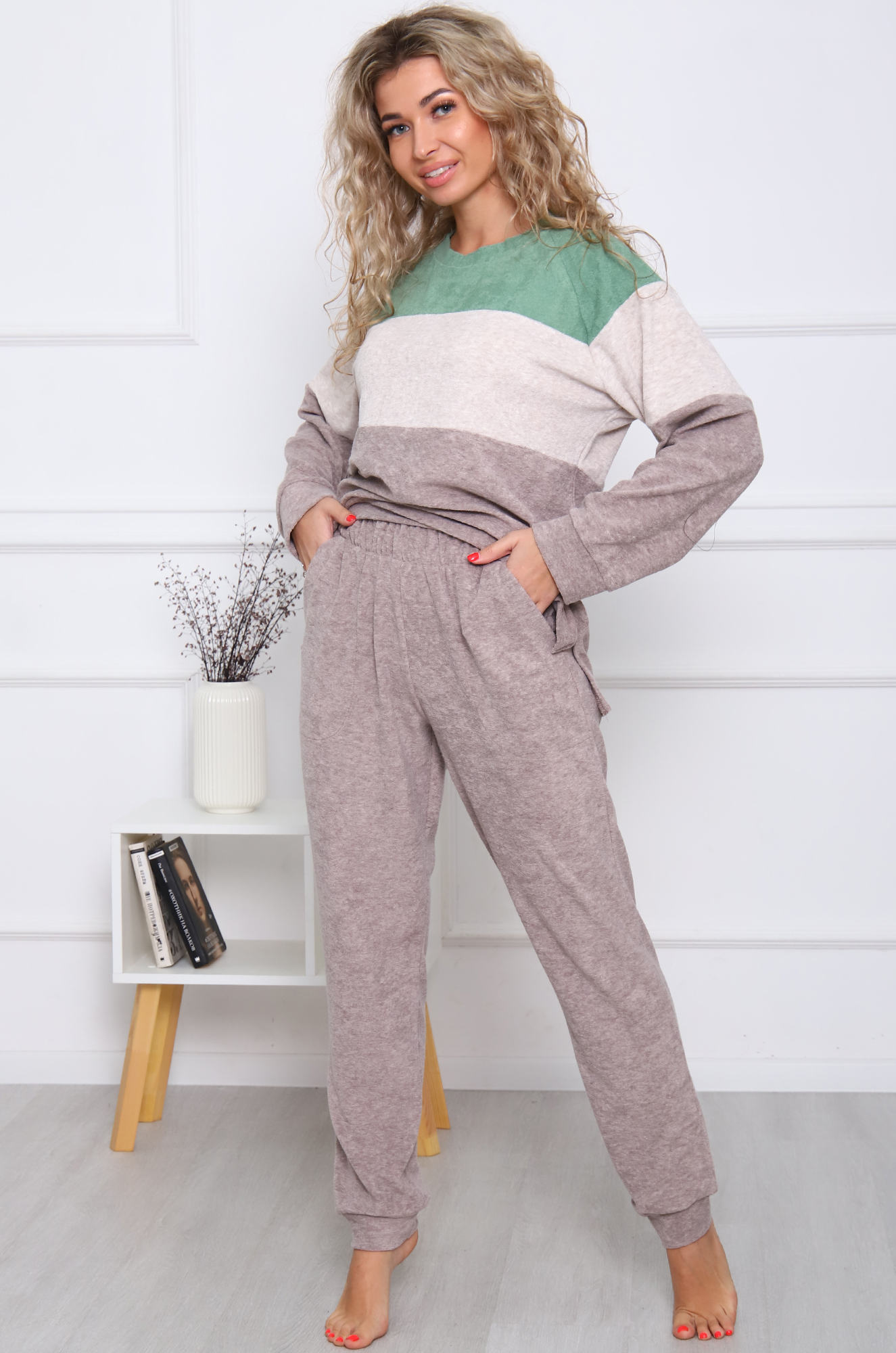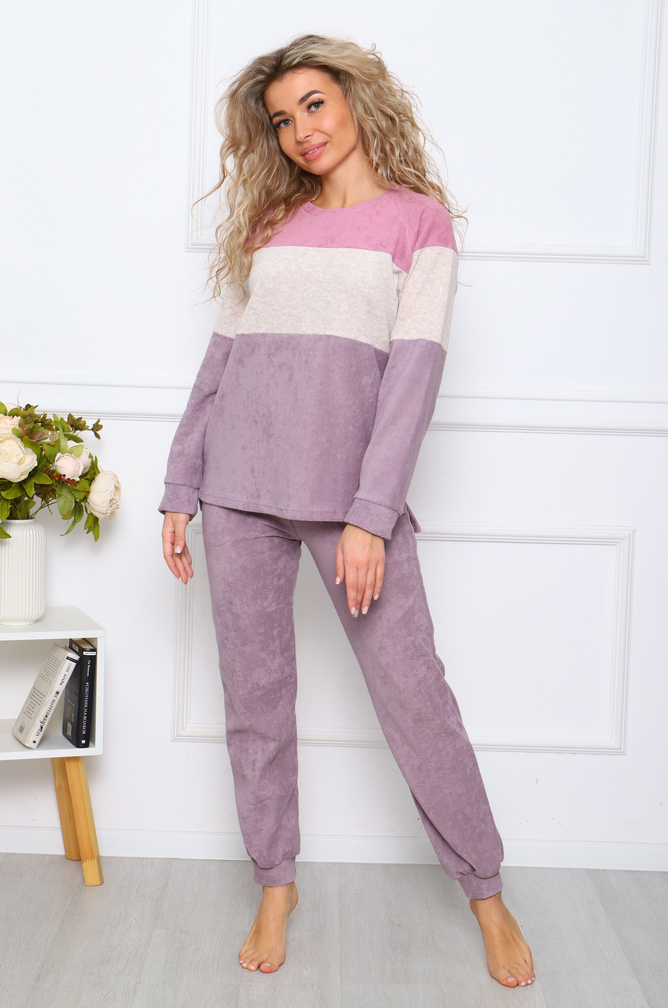 Очень симпатичный, тёплый и уютный махровый костюм для домашнего отдыха. Толстовка комбинированная, прямого кроя, с удлинённой спинкой, по бокам разрезы, рукава на манжетах. Брючки на манжетах, пояс на широкой резинке, с глубокими боковыми карманами. Ткань махра - мягкая и приятная к телу.