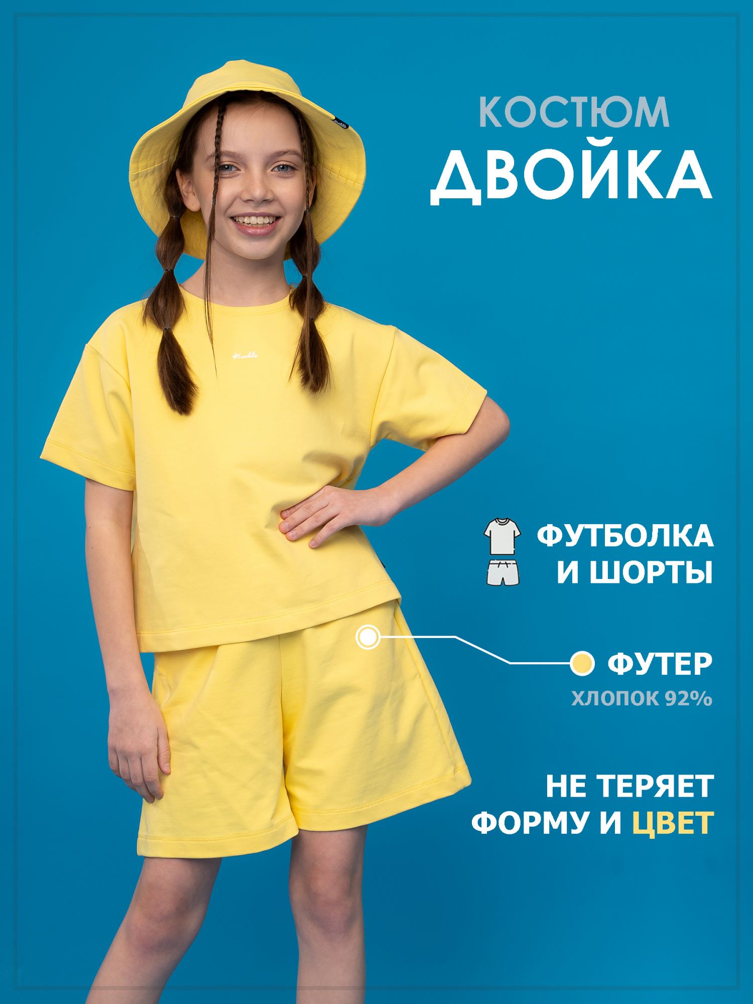 Костюм- двойка из футера лимонного цвета для девочки . Состоит из футболки и шорт. Укороченная футболка свободного силуэта со спущенной линией плеча и рукавами длиной до локтя. Удобные шорты с боковыми карманами, пояс на эластичной резинке. Изделие выполнено из трикотажа премиального качества - ПЕНЬЕ, с содержанием хлопка более 92%
