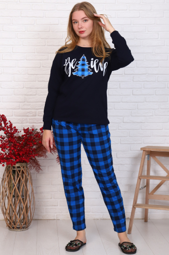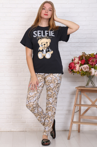 Симпатичный и удобный костюм для дома.Футболка прямого кроя, на полочке печатный принт. Брючки зауженные, с удобными боковыми карманами, пояс на широкой резинке.
