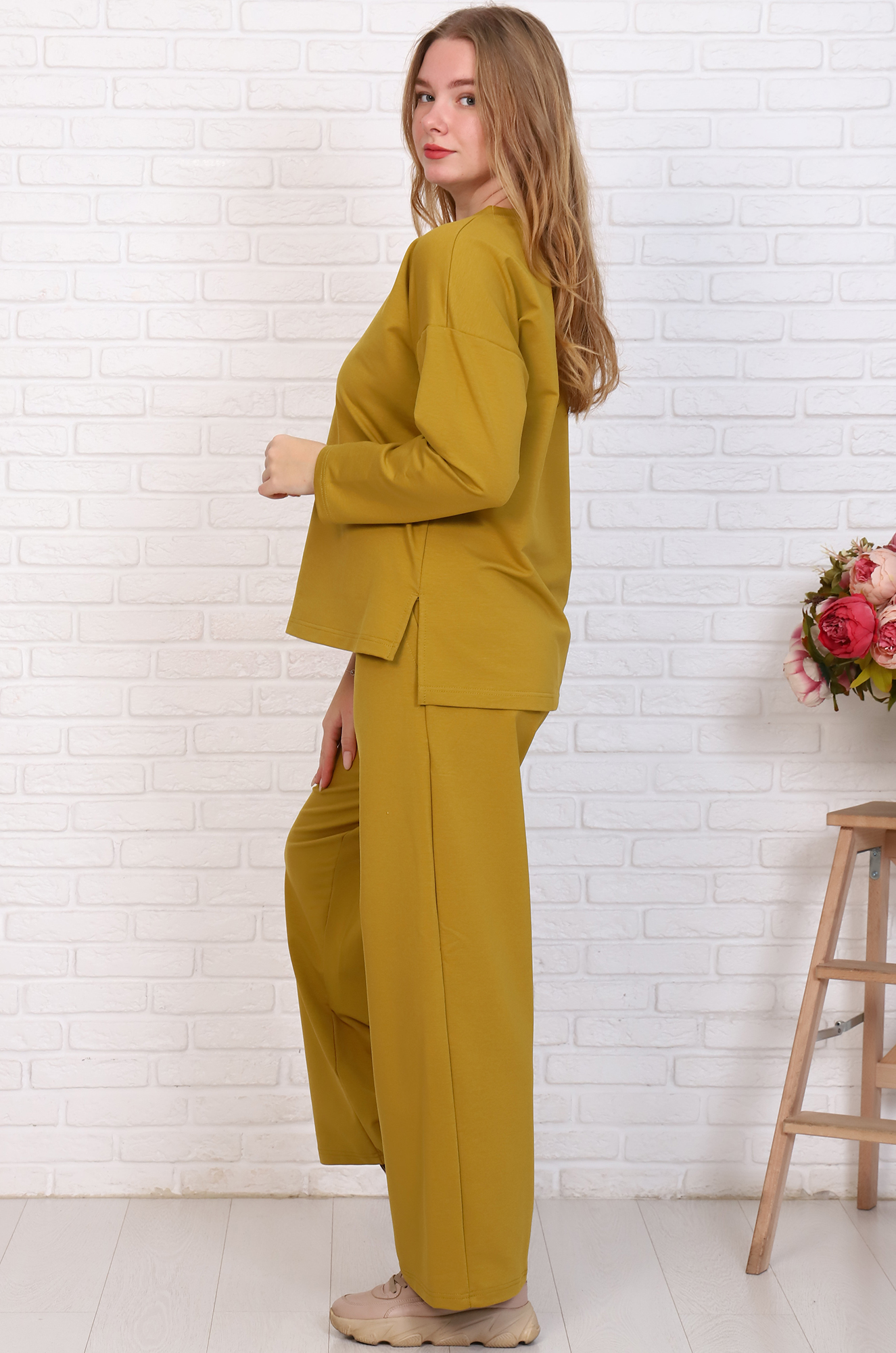 Удобный и стильный женский костюм для повседнего образа. Свитшот прямого, свободного кроя, с удлинённой спинкой, по бокам разрезы. Модные брюки палаццо с удобными боковыми карманами, пояс на широкой резинке. Отличный вариант для прогулки по парку, встреч с подружками или просто за покупками.