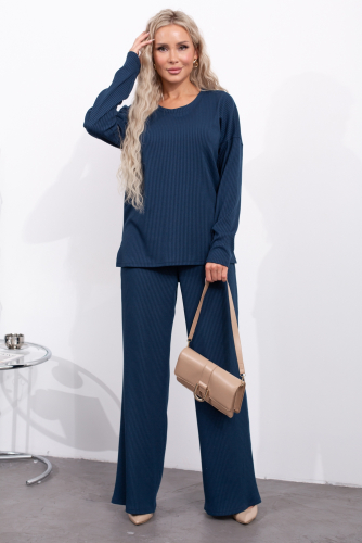 Стильный костюм из трикотажного полотна. Джемпер свободного кроя. Длинный рукав со спущенным плечом. Округлая горловина. Низ ровный, по бокам разрезы. Практичные брюки свободного кроя. Комфортную посадку на талии обеспечивает притачной пояс с эластичной резинкой. Модель без застежки.