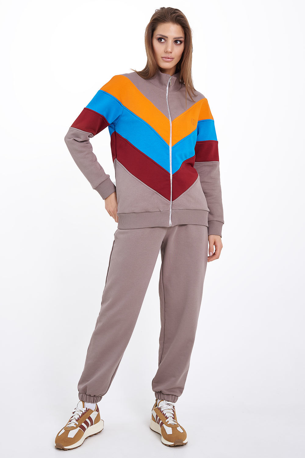 Джемпер с дизайнерскими, наклонными резами и на переде, и на спинке, выполненных из разных контрастных оттенков. Рукава визу имеют манжеты. Воротник-стойка, манжеты, низ джемпера выполнены из ткани-компаньена кошкорсе. На левом переде вышит логотип в цвет полоски. Брюки имеют современный крой и облегание, удобные карманы на передних половинка, притачной пояс и резинку внутри. Низ брюк присобран на резинку.