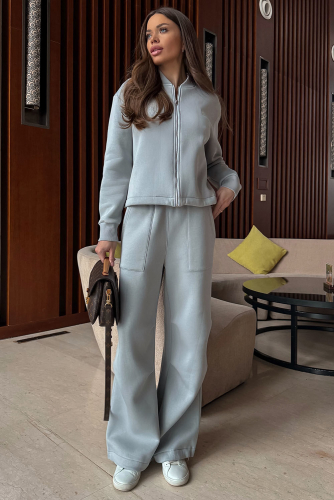 Современный комфортный костюм, состоит из брюк карго и укороченного бомбера. Отлично подойдёт для дома, прогулок, путешествий и отдыха. Пошит из теплой, комфортной ткани. Бомбер прямого силуэта, с застежкой молнией из металла. Горловина, манжеты рукавов выполнены из ткани-компаньона кошкорсе. На левом переде вышивка-логотип в цвет ткани. Бомбер с кулисой по низу с резинкой внутри и фиксаторами на боковых швах. Брюки расширенные к низу, с возможностью заузить и зафиксировать ширину внизу (низ имеет кулиску с резинкой и фиксатором). На передних половинках брюк удобные накладные карманы, складки в районе линии колен. Пояс из ткани компаньена кошкорсе со шнуром и резинкой внутри.