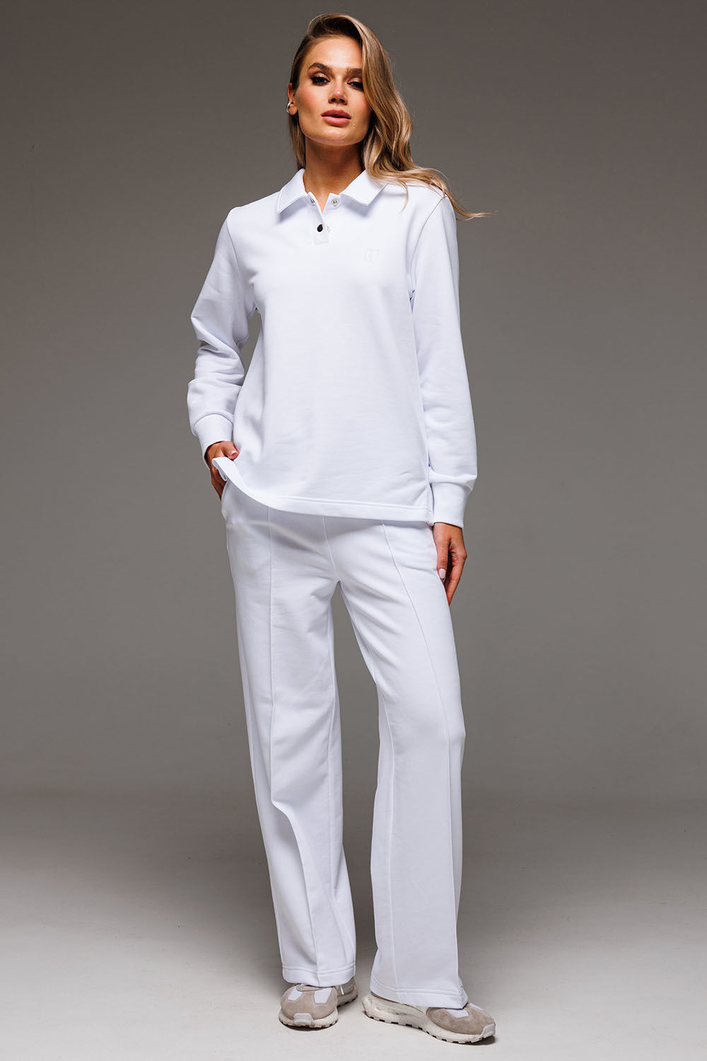 Для очаровательного образа не хватает воротничка! Воротник и застежка поло - маленькая деталь, которая «смягчает» и делает нежным весь аутфит. Брюки со стрелками добавят образу строгости и деловитости, что позволит носить костюм как на прогулки, так и в офис. Пошит из комфортной ткани - футера 3-нитки без начеса.