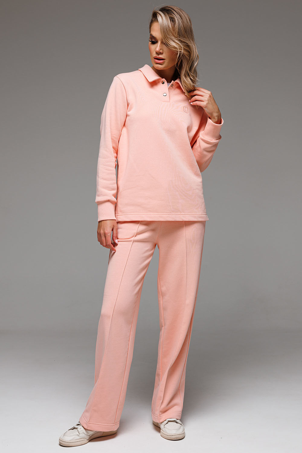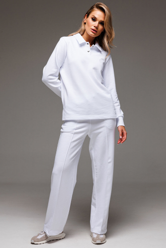 Для очаровательного образа не хватает воротничка! Воротник и застежка поло - маленькая деталь, которая «смягчает» и делает нежным весь аутфит. Брюки со стрелками добавят образу строгости и деловитости, что позволит носить костюм как на прогулки, так и в офис. Пошит из комфортной ткани - футера 3-нитки без начеса.
