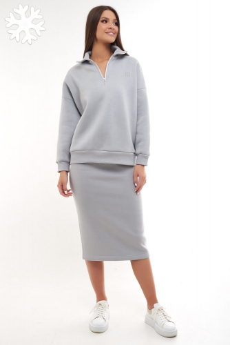 Женственный теплый комплект изготовлен из футера с начёсом, состоит из джемпера покроя оверсайз и юбки миди. Джемпер имеет контрастную короткую застёжку- молнию по центру переда, которая переходит в стойку. Слева на переде вышивка-логотип в цвет ткани.  Рукава имеют притачную манжету. Манжеты рукавов, стойка и низ изделия выполнены из ткани- компаньона кошкорсе. Юбка, зауженная к низу, облегающая фигуру, длиной миди. В среднем шве спинки разрез. Пояс из ткани кошкорсе, с резинкой внутри.