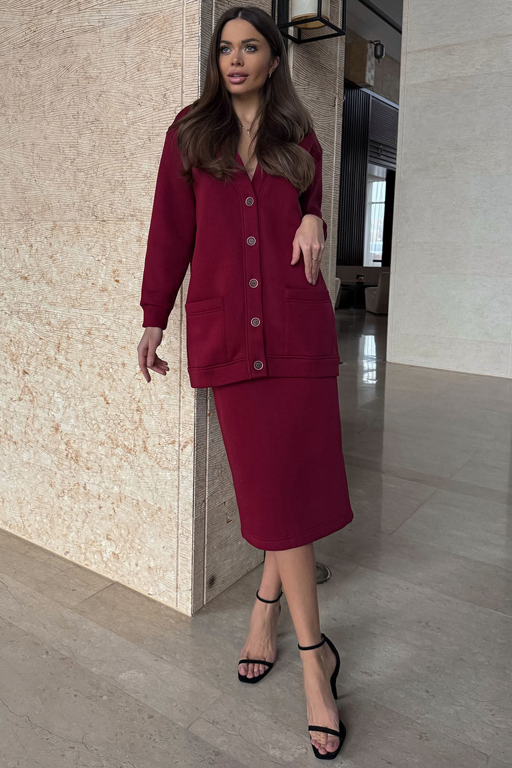 Современный женственный комплект, состоит из кардигана и прямой юбки. Кардиган имеет прямой силуэт и длинные рукава с мажетами (из ткани кошкорсе). Вырез горловины Y-образной формы с притачной планкой. Застежка по центру переда на петли и пуговицы. На переде удобные карманы. По планкам, по карманам, проложена отделочная строчка. Юбка зауженная к низу, облегающая фигуру, длиной миди. В среднем шве спинки разрез. Пояс из ткани кошкорсе, с резинкой внутри.