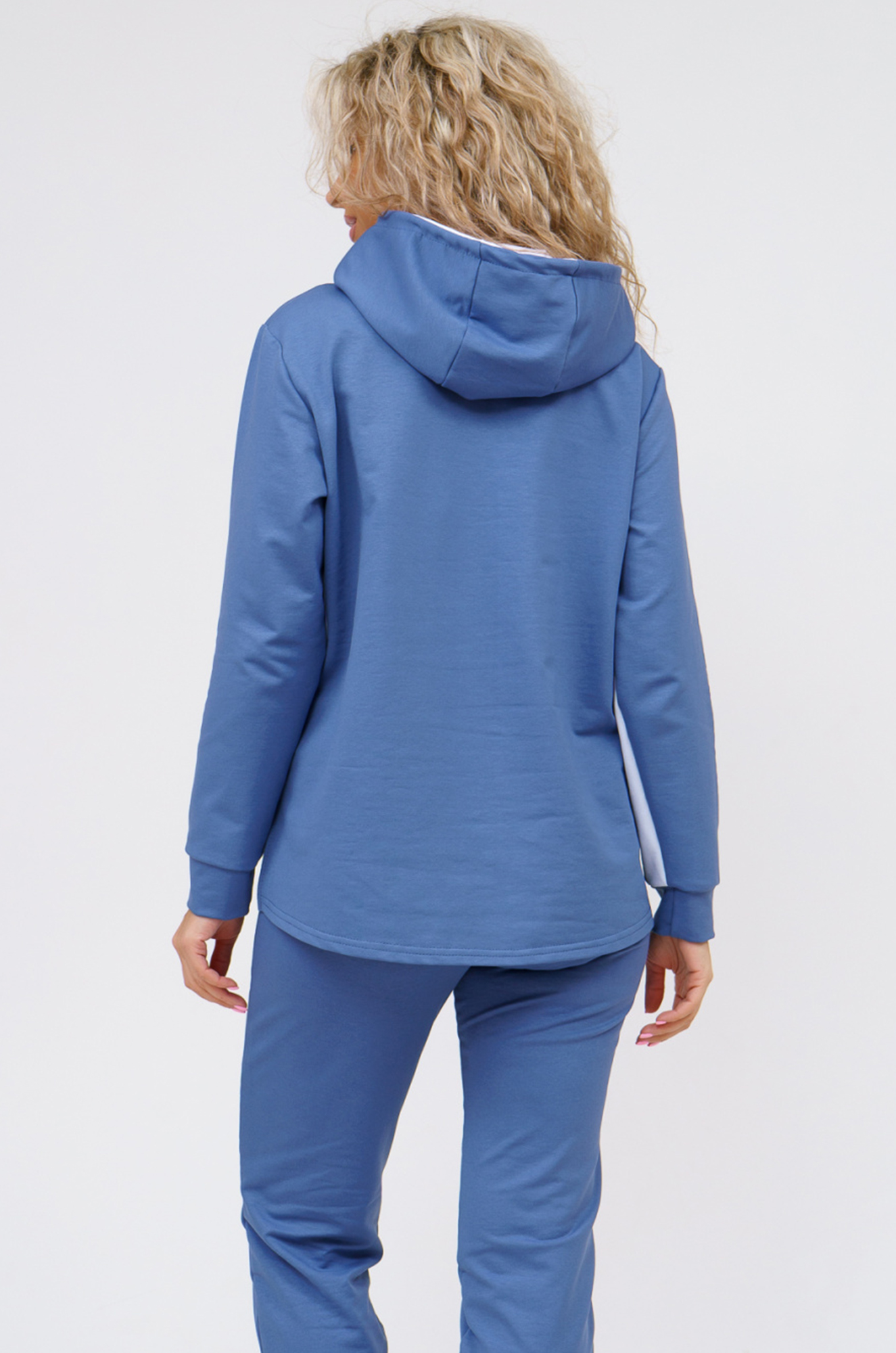 Удобный женский костюм спортивного кроя подойдёт и для дома и для прогулок в парке. Толстовка комбинированная, с контрастной горизонтальной вставкой и с капюшоном. Рукава и нижняя часть полочки на манжете, спинка удлинённая. Внизу по бокам небольшие разрезы. Брюки прямого кроя, с боковыми карманами, пояс на широкой резинке.