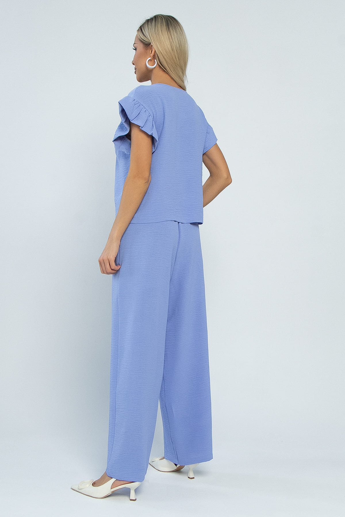 Брючный костюм из струящейся ткани подойдет для городского стиля жизни в сочетании с кроссовками, и в качестве вечернего образа на каблуках.Блуза прямого кроя, вырез горловины - округлый, пройма оформлена оборкой-крылышком. Прямые свободные брюки, талия на резинке, в боковых швах есть карманы.