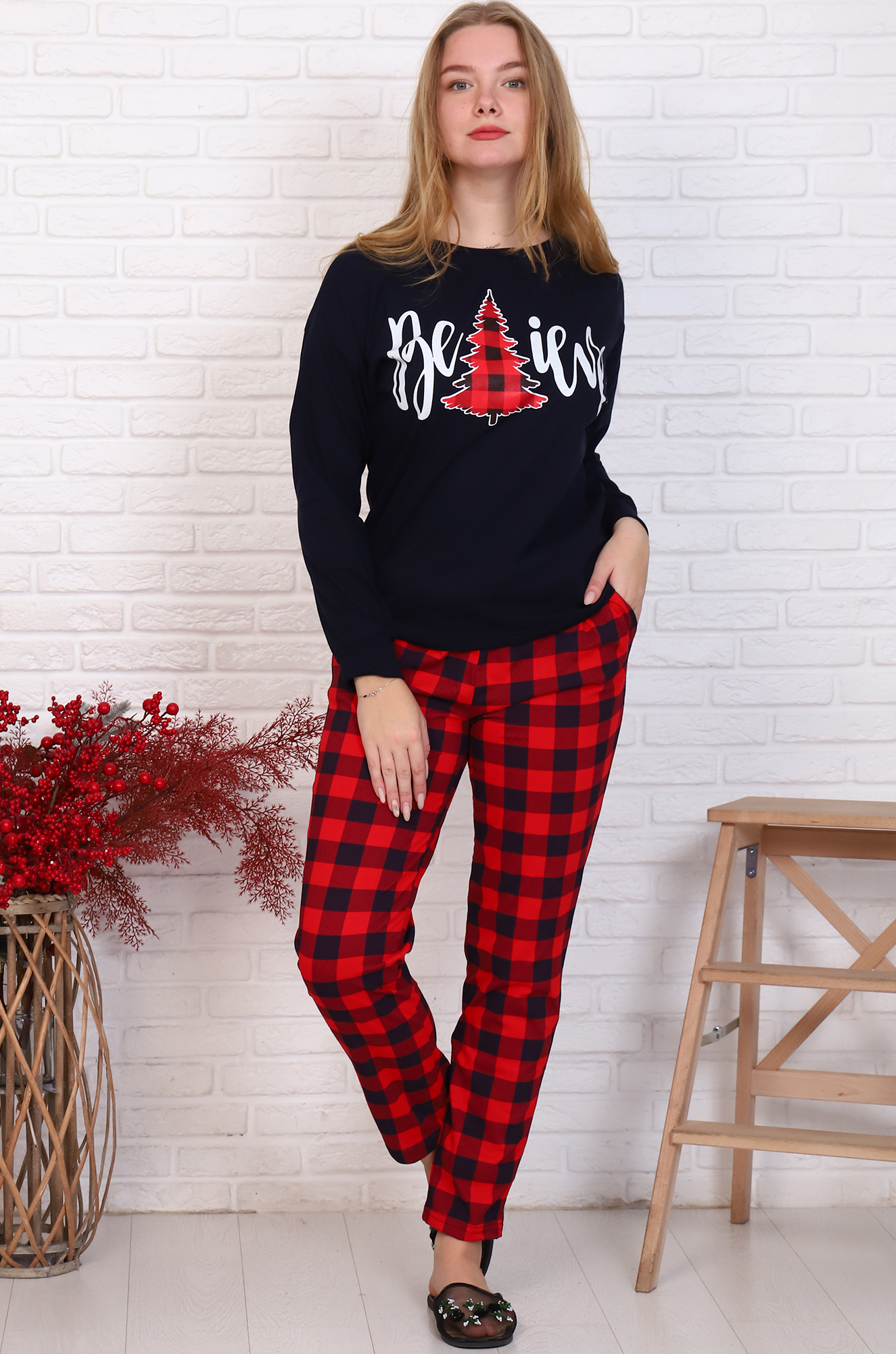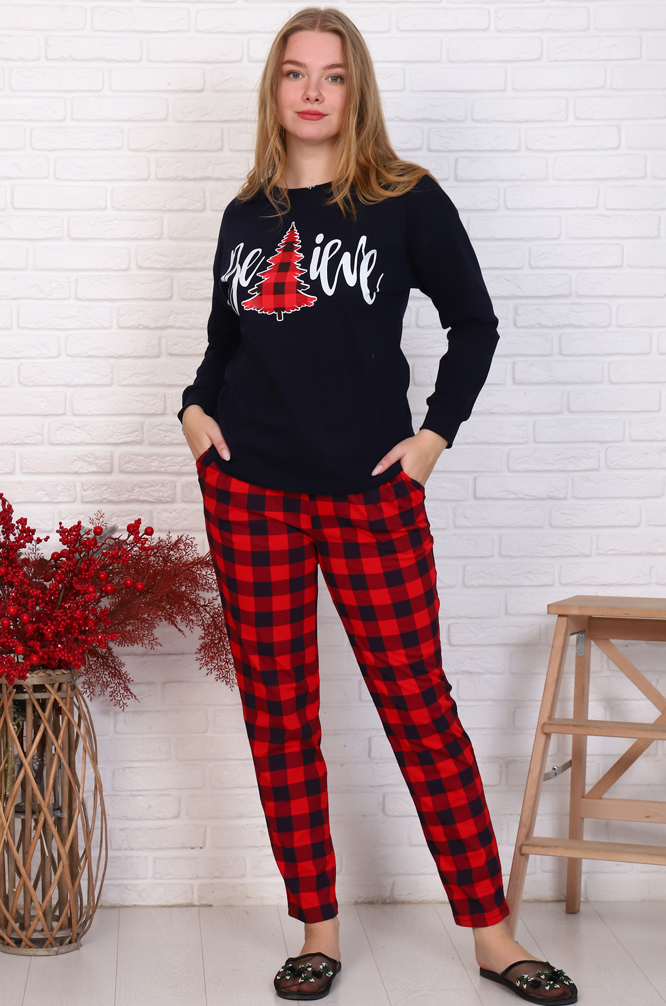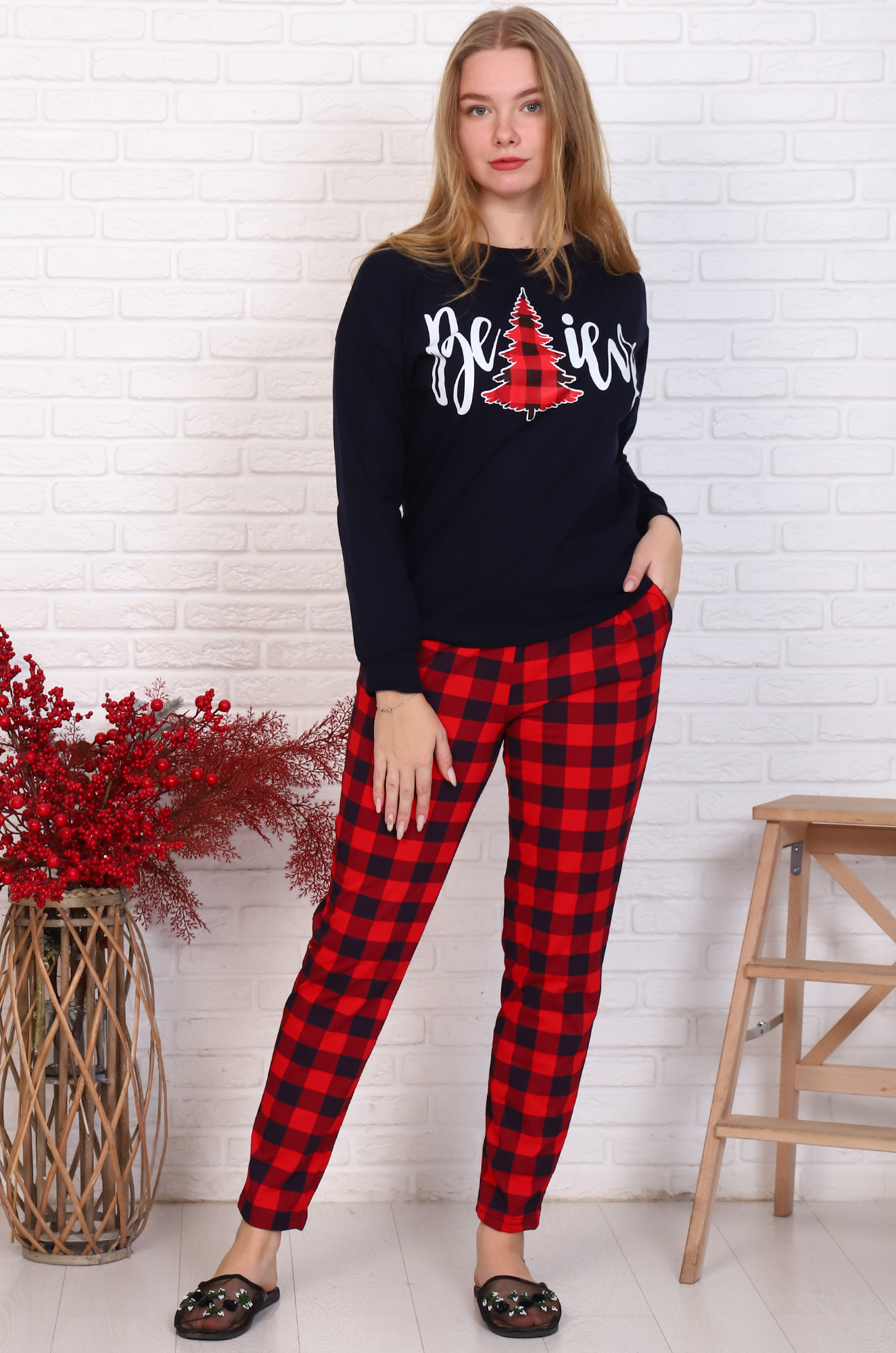 Симпатичный и удобный домашний костюм из качественного кулирного полотна. Футболка с длинным рукавом, на полочке "новогодняя" печать, рукава и горловина обработана рибаной. Брюки с боковыми карманами, зауженные к низу, пояс на резинке.
