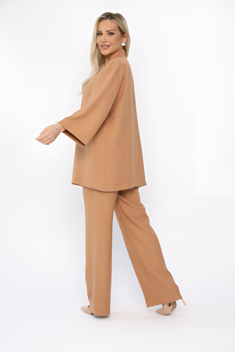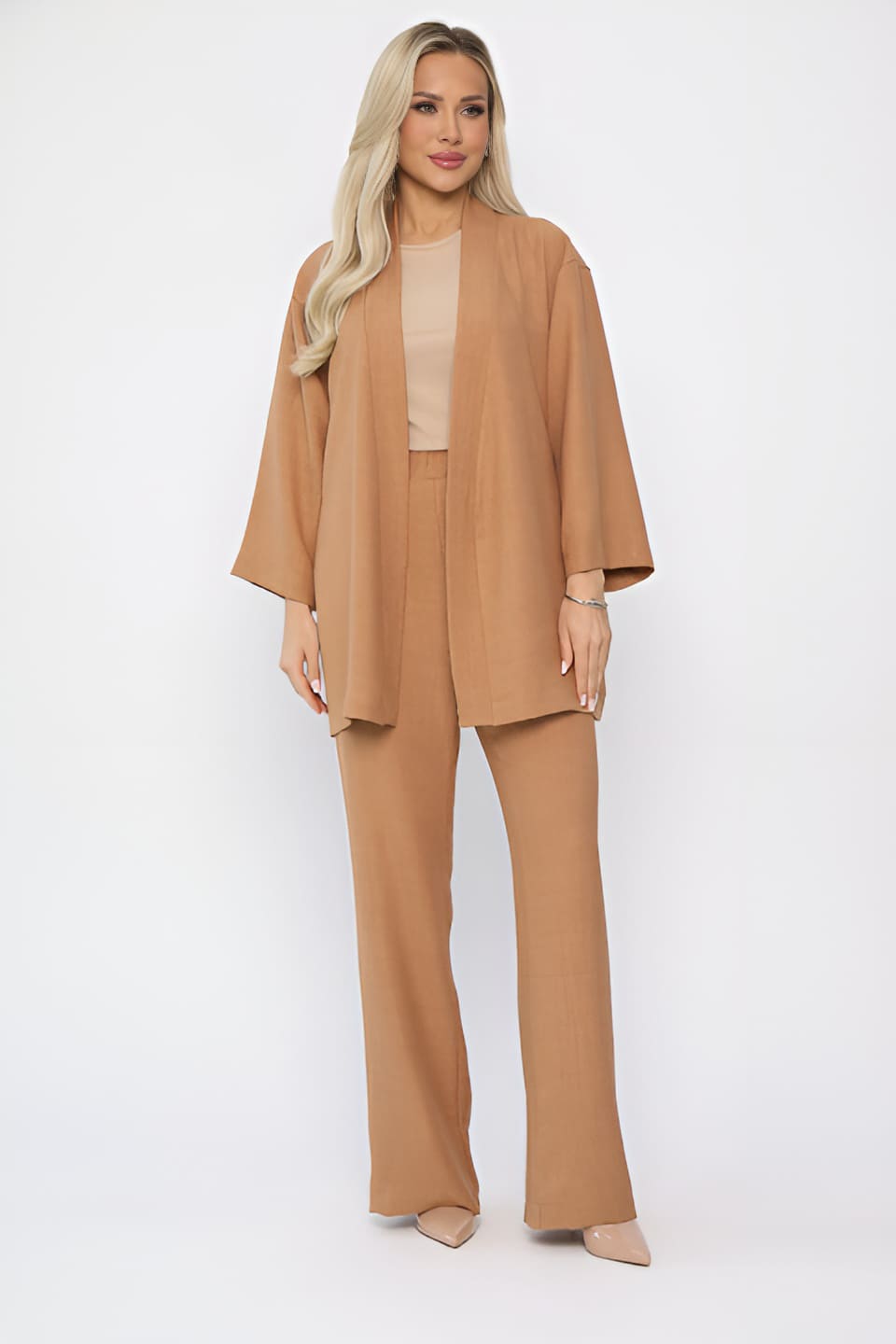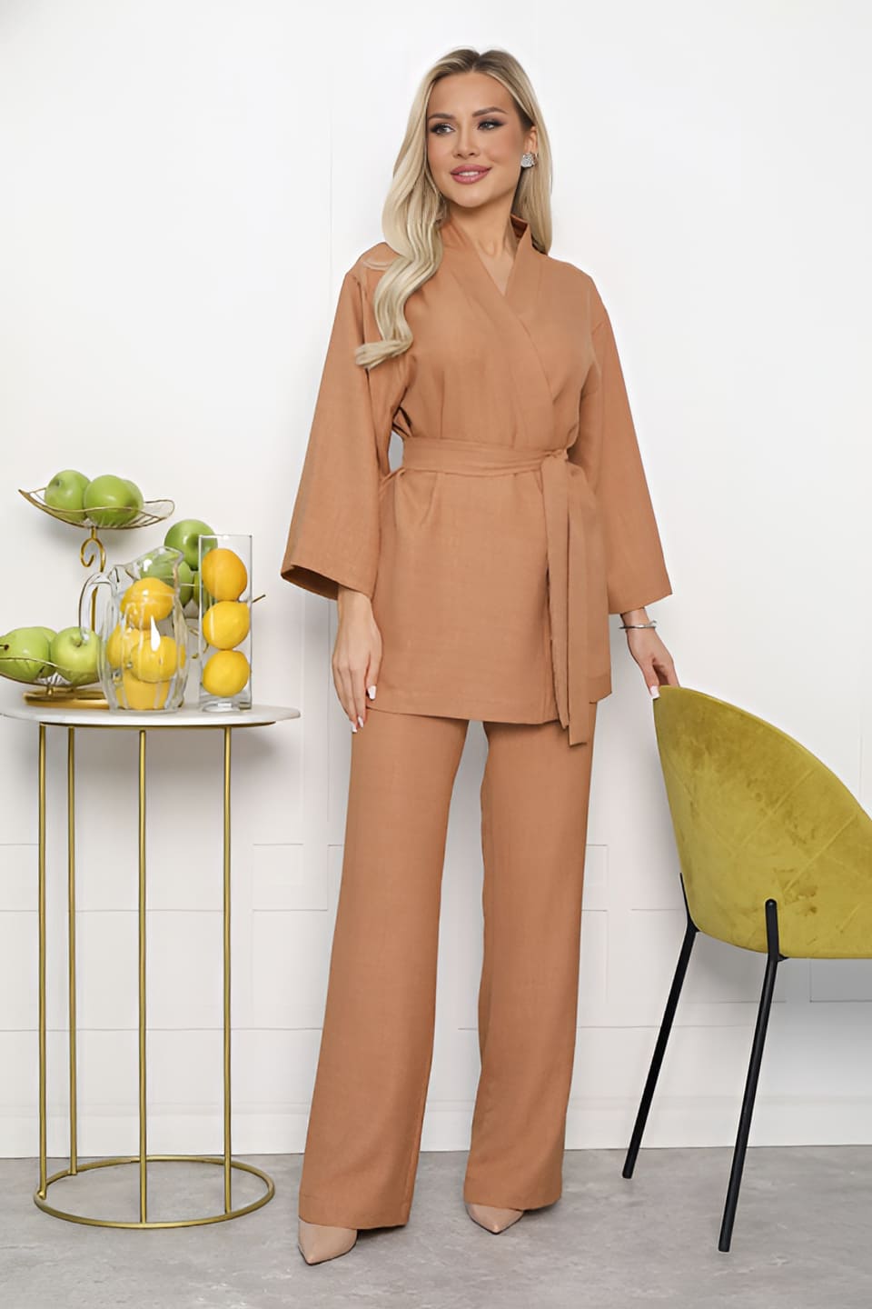 Костюм выполнен излегкой ткани — отличный вариант для повседневной носки в летнюю погоду. Комплект двойки состоит из рубашки в стиле кимоно со спущенным рукавом и прямых брюк, которые по талии на резинке. Вы сможете носить их как вместе, так и раздельно. Комфортный комплект в свободном стиле, благодаря своей посадке, отличный вариант не только для городского образа, но и для походов на пляж. В комплекте пояс из основной ткани.
