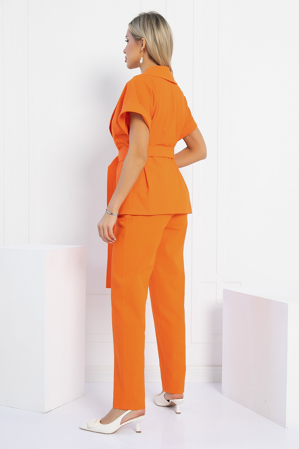 Летний женский брючный костюм из натуральных тканей — это идеальный выбор для повседневного ношения в жаркие дни! Брюки классического кроя с резинкой по талии и карманами по боковым швам обеспечат вам удобство и комфорт. Верх костюма с шалевым воротником и цельнокроеными рукавами на манжетах придадут вашему образу элегантность и утонченность. А пояс из основной ткани на двух полукольцах завершит стильный образ. Этот костюм станет вашим незаменимым спутником в летние дни, позволяя вам чувствовать себя уверенно и комфортно. Ткань жатая, не имеет растяжения.
