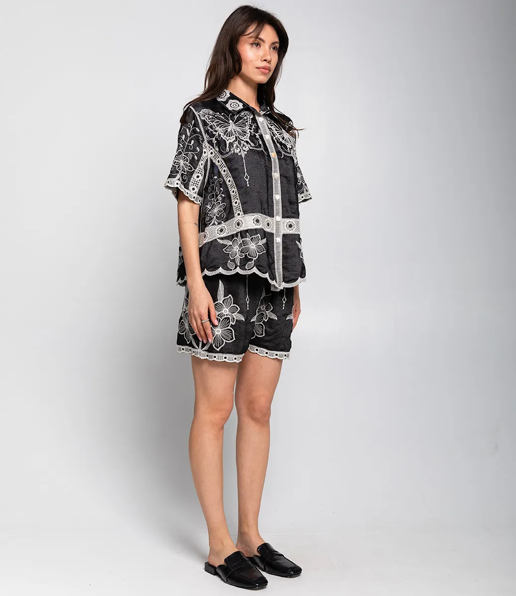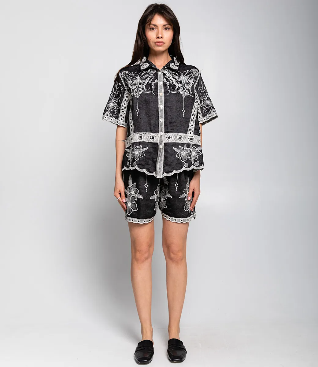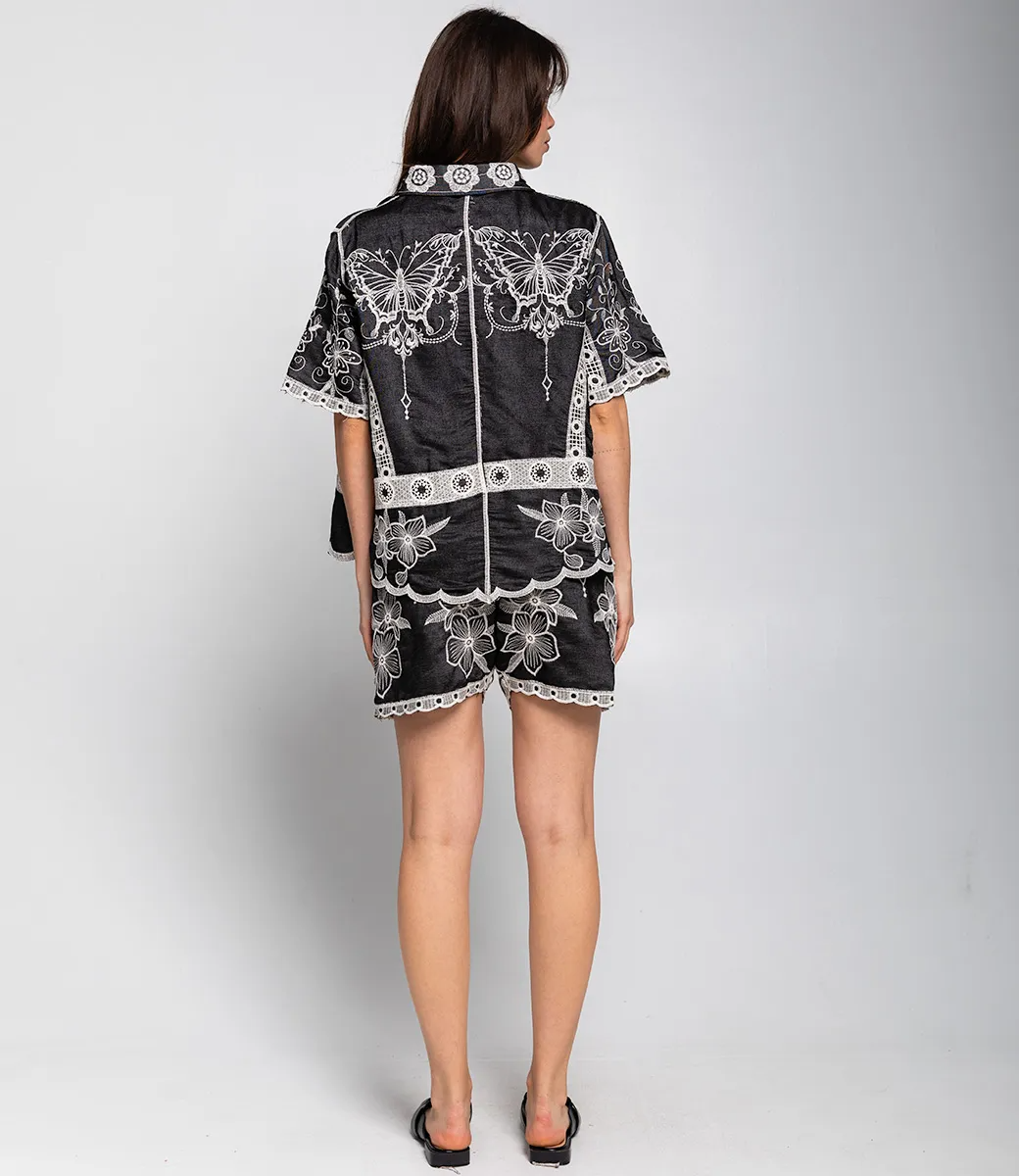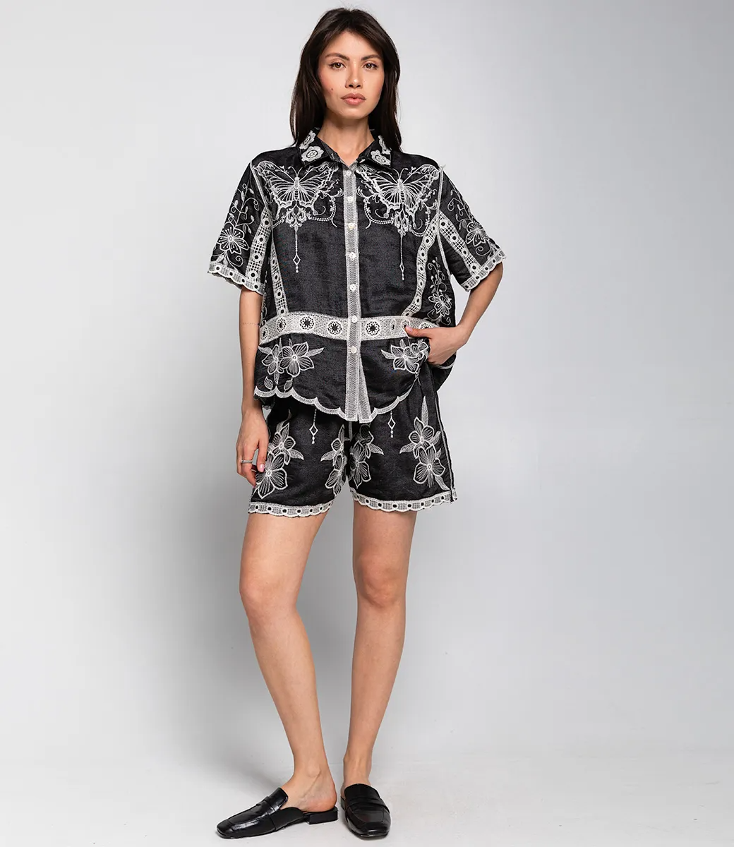 Костюм – это эффектная часть гардероба, подчеркивающая женственность и уникальность каждой представительницы прекрасного пола. Костюм состоит из двух частей — рубашки и шорт. Воротник классического типа, короткие рукава, также украшены вышивкой с цветочными и геометрическими узорами, включающими крупные бабочки. Нижний край рубашки оформлен волнистым краем с вышитым белым орнаментом. Шорты выполнены цветочными узорами и геометрическим орнаментом по низу. Для пошива этого костюма использованы ткань с составом 65% хлопок и 35% полиэстер, что гарантирует отличное качество и долговечность. Костюм легко выдерживает множество стирок, сохраняя свою первоначальную привлекательность и комфорт. Обратите внимание на цвет и фактуру ткани – они полностью соответствуют фото на сайте и прекрасно дополнят любой летний образ. Для уверенности в размере мы представили на странице таблицу, чтобы вы могли самостоятельно обмерить себя и убедиться в идеальной посадке костюма. Предложенная нами цена является приемлемой, что делает этот комплект отличным выбором для оптовых покупателей. Не упустите возможность предложить вашим клиенткам этот стильный костюм, который станет их любимым выбором для летних дней! Позвольте вашим покупательницам наслаждаться комфортом и элегантностью с этим великолепным комплектом! Рост модели: 164, параметры: 83-61-89.