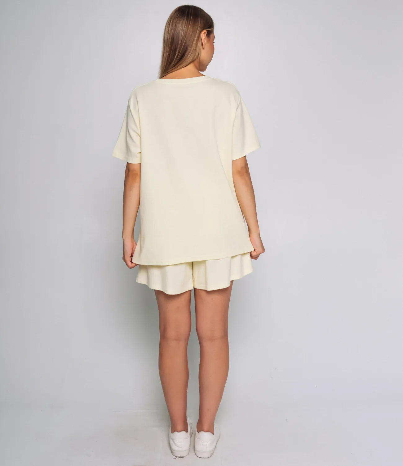 Костюм — это идеальное сочетание удобства и стиля, которое поможет каждой женщине выглядеть непревзойденно в любой ситуации. Этот комплект состоит из двух предметов — футболки и шорт, которые гармонично дополняют друг друга и создают завершенный образ. Футболка свободного кроя с короткими рукавами и круглым вырезом выполнена из высококачественного материала, содержащего 65% хлопка, 30% полиэстера и 5% эластана. На передней части расположен крупный принт с текстом и графическим элементом, что придаёт модели оригинальности и современного звучания. Такой дизайн привлекает внимание и позволяет создавать яркие образы, подчеркивая индивидуальность каждой носительницы. Шорты средней длины с эластичным поясом обеспечивают комфортную посадку и свободу движений. Эта модель отлично подходит как для повседневной носки, так и для активного отдыха. Комбинация удобного кроя и стильного оформления делает костюм универсальным элементом гардероба, который легко сочетать с различной обувью и аксессуарами. Обратите внимание на качество ткани, которое гарантирует долговечность и сохранение формы даже после множества стирок. Мы также предоставили на странице таблицу размеров, чтобы ваши покупательницы могли легко подобрать подходящий размер и быть уверенными в своем выборе. Предложенная нами цена является доступной и приемлемой для оптовых покупателей, что позволит вам легко расширить ассортимент вашего магазина. Не упустите возможность предложить своим клиентам этот стильный и комфортный костюм, который станет их любимым выбором для летних дней и активных мероприятий! Подарите своим клиентам возможность быть стильными и уверенными в себе! Рост модели 168 см., 89-63-90.
