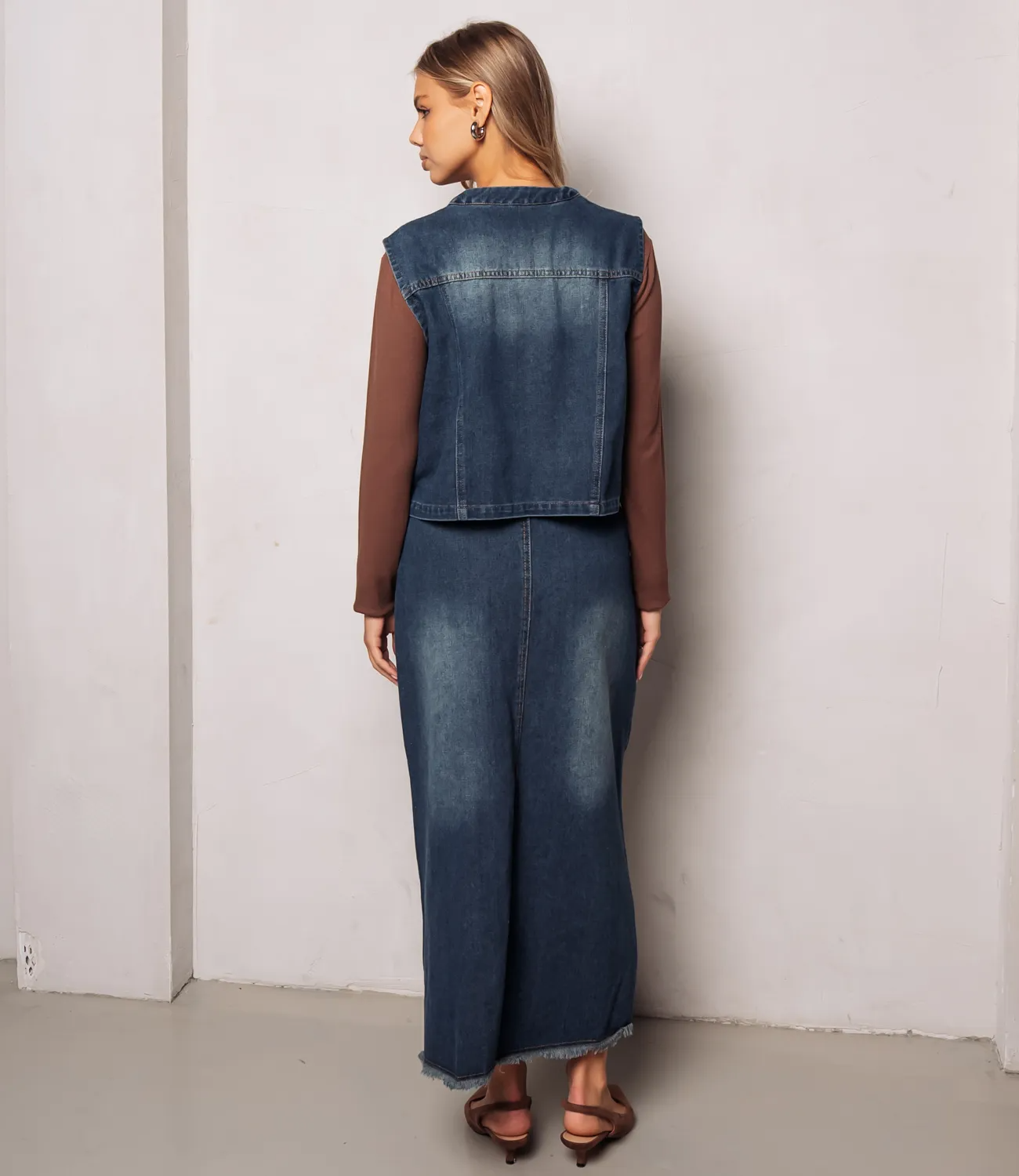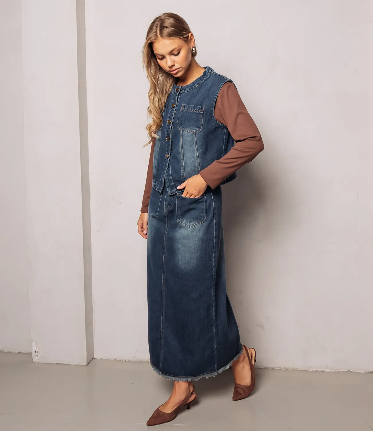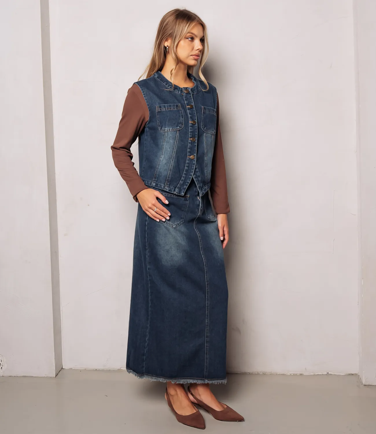 Костюм — это безупречный выбор для женщин, которые стремятся подчеркнуть свою уникальность и элегантность. Жилет без рукавов, длиной до талии. Застёжка спереди на крупные пуговицы светлого тона. Длинная юбка макси из того же денима, с высокой посадкой и вертикальными швами, визуально удлиняющими фигуру. Состав 100% хлопок. Предложенная нами цена является доступной и приемлемой для оптовых покупателей, что дает возможность расширить ассортимент вашего магазина, привлечь новую аудиторию и удовлетворить потребности ваших клиентов. Не упустите шанс предложить своим покупательницам этот великолепный костюм, который станет незаменимым элементом их гардероба!
