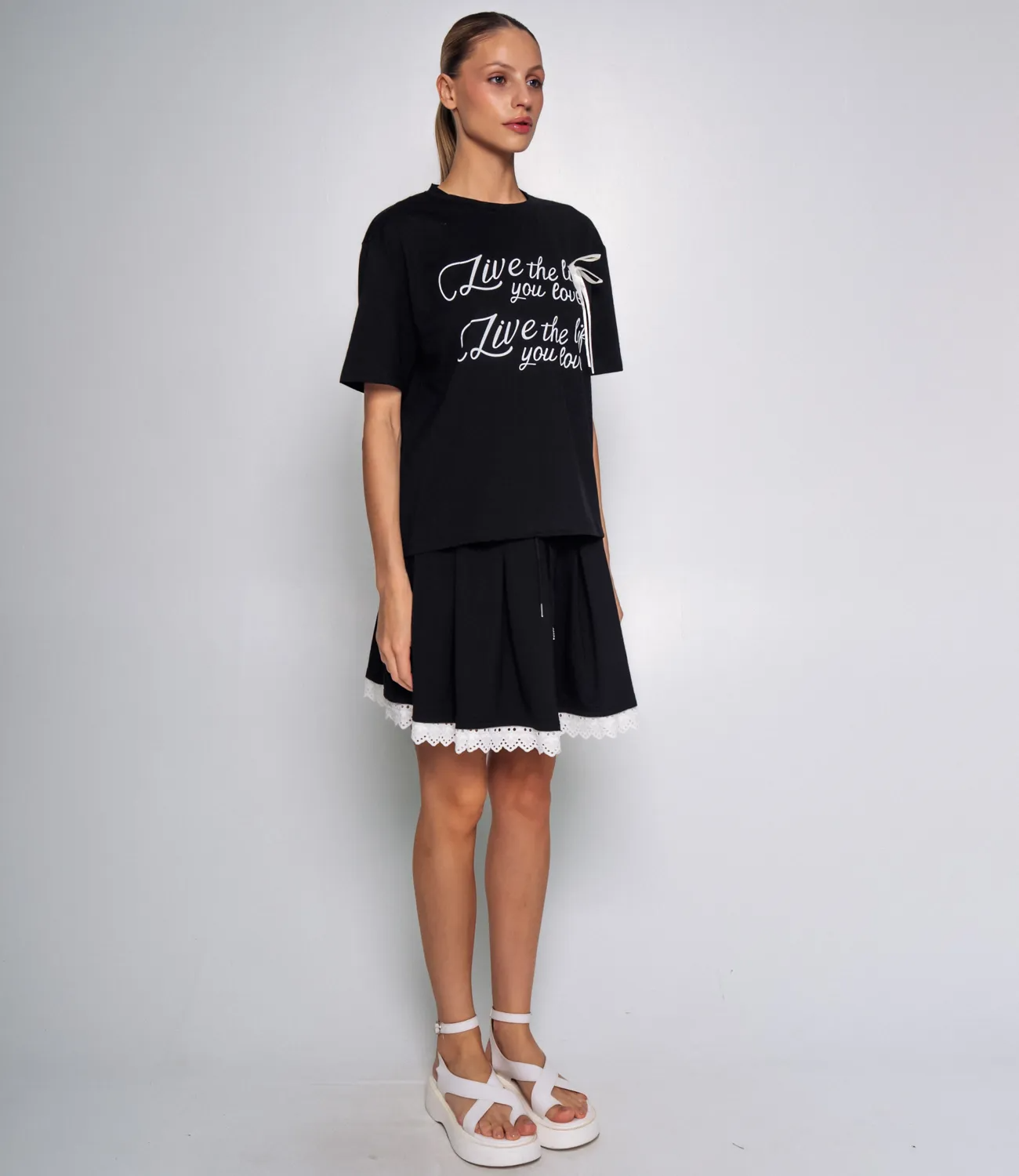 Костюм — это безупречный выбор для женщин, которые стремятся подчеркнуть свою уникальность и элегантность. Наш комплект состоит из двух стильных предметов — футболки и юбки, которые идеально гармонируют друг с другом и создают завершенный образ. Футболка свободного кроя с короткими рукавами и круглым вырезом выполнена из мягкой и дышащей ткани, состоящей из 65% хлопка, 30% полиэстера и 5% эластана. На передней части футболки нанесена дважды повторяющаяся надпись с декоративной лентой на груди, что добавляет акцент и делает изделие особенно привлекательным. Юбка, выполненная на эластичном поясе с завязкой, средней длины, с легкими складками, обеспечивает удобство и свободу движений. Ее стильный дизайн подчеркивает женственность и позволяет легко сочетать эту модель с различными топами и обувью. Декоративная отделка в виде ажурной каймы по низу юбки добавляет изысканности и завершенности всему образу. Этот комплект станет отличным вариантом для повседневной носки, идеально подходя как для работы, так и для прогулок по городу. Мы уверены, что ваши покупательницы оценят отличное качество тканей и завершенность дизайна, что позволит им чувствовать себя комфортно и стильно в любой ситуации. Обратите внимание на доступные цвета, которые полностью соответствуют фотографиям на сайте. Мы также предоставили на странице таблицу размеров, чтобы каждая клиентка могла легко и быстро подобрать подходящий размер и быть уверенной в своем выборе. Предложенная нами цена является доступной и приемлемой для оптовых покупателей, что дает возможность расширить ассортимент вашего магазина, привлечь новую аудиторию и удовлетворить потребности ваших клиентов. Не упустите шанс предложить своим покупательницам этот великолепный костюм, который станет незаменимым элементом их гардероба!