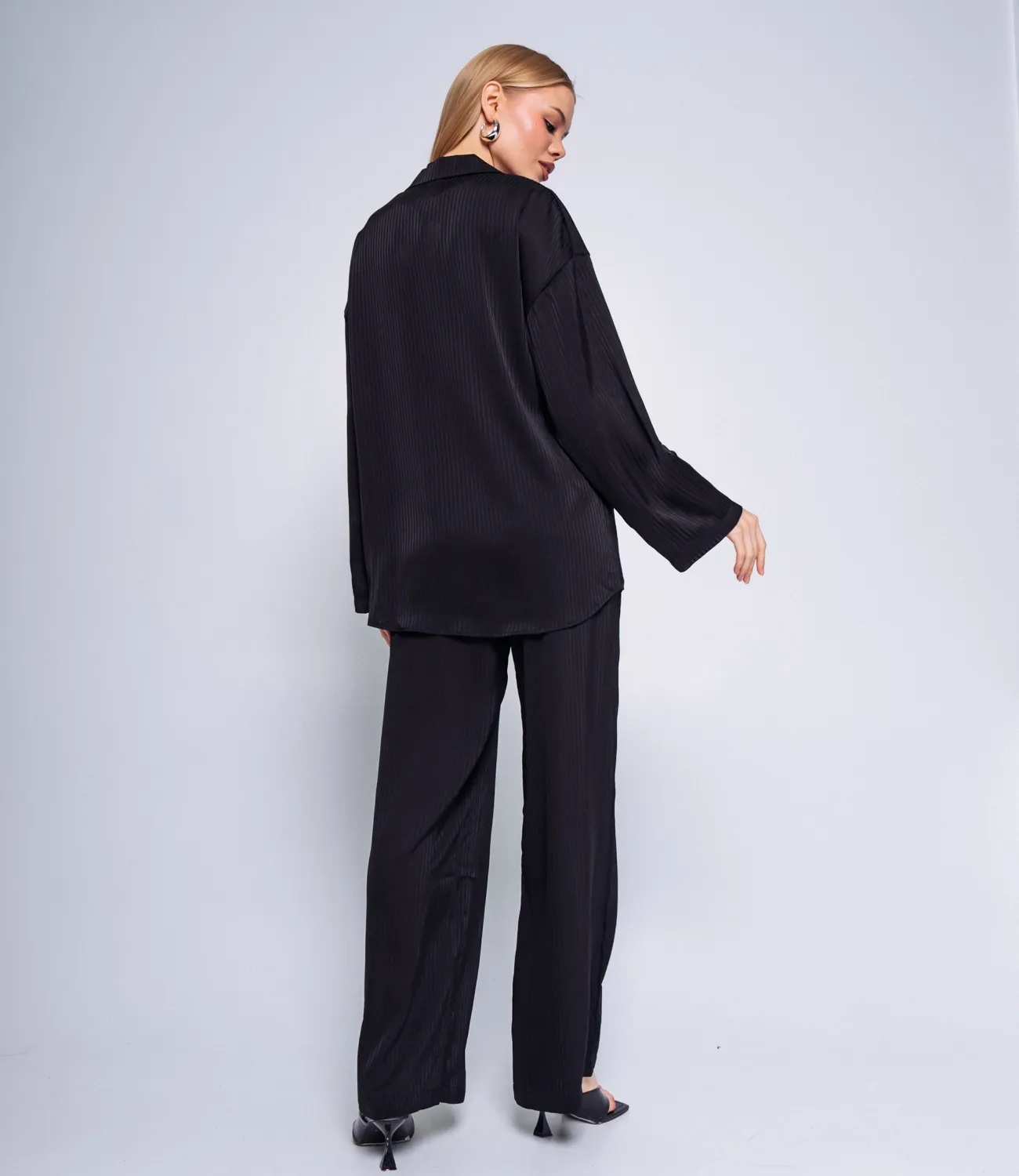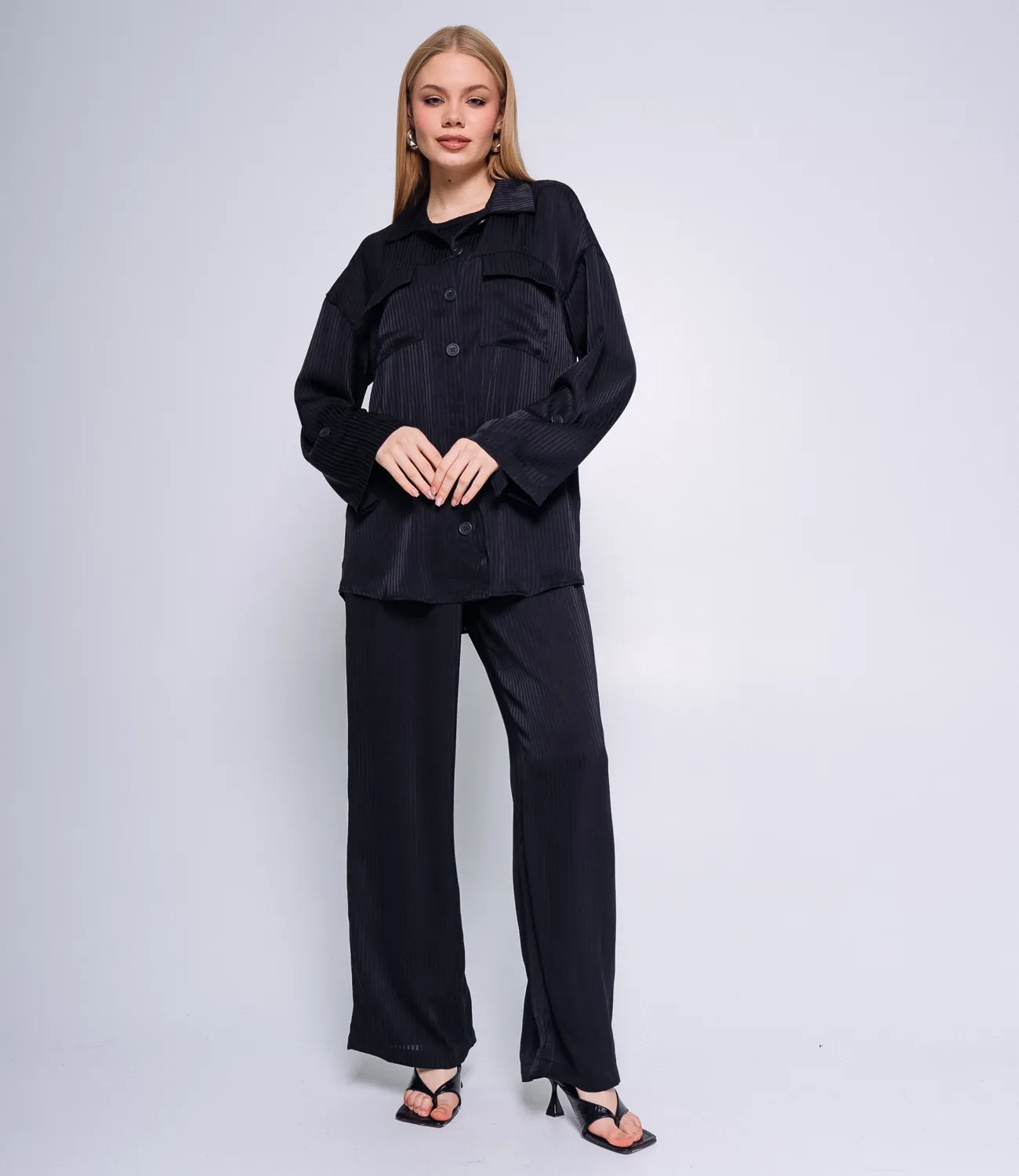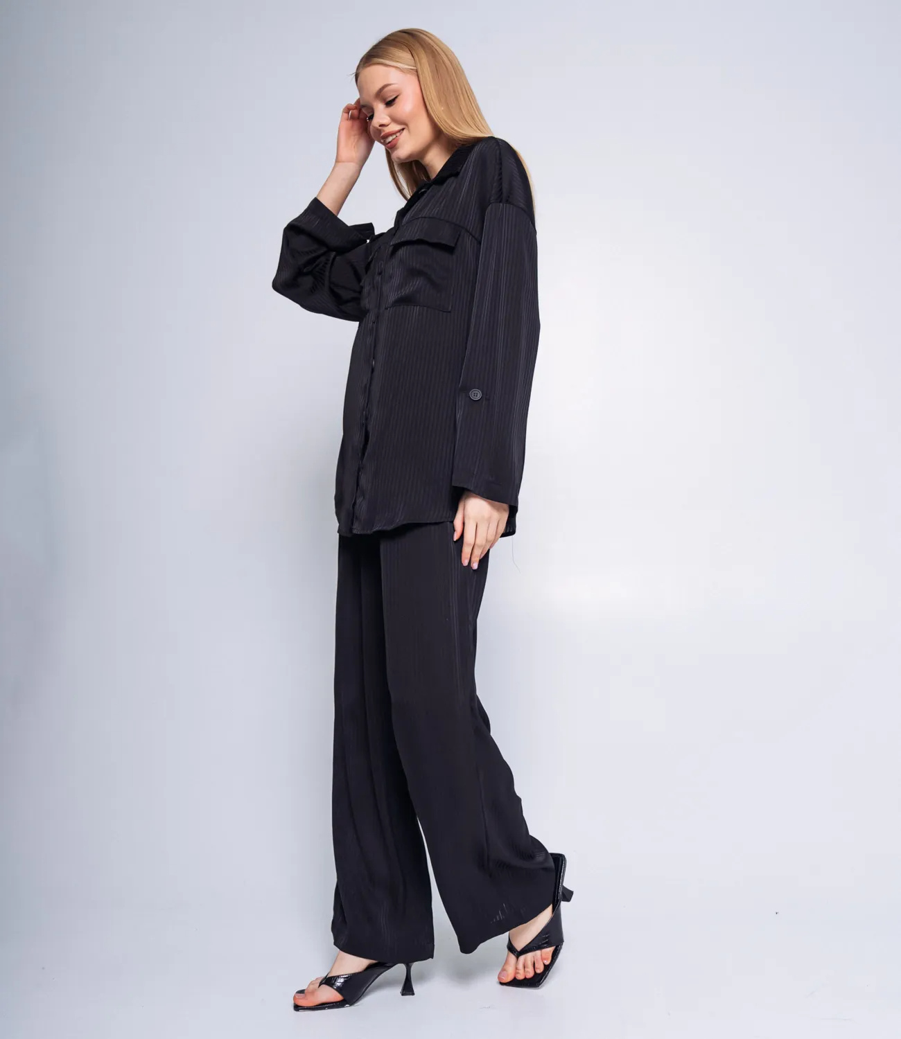 Брюки этого костюма имеют удобную резинку, что позволяет легко подогнать их под вашу талию и обеспечивает комфортную посадку. Эта деталь делает брюки универсальными и позволяет легко регулировать размер по вашему желанию. Рубашка также является легкой и приятной на ощупь. Она имеет классический крой с пуговицами и воротником.